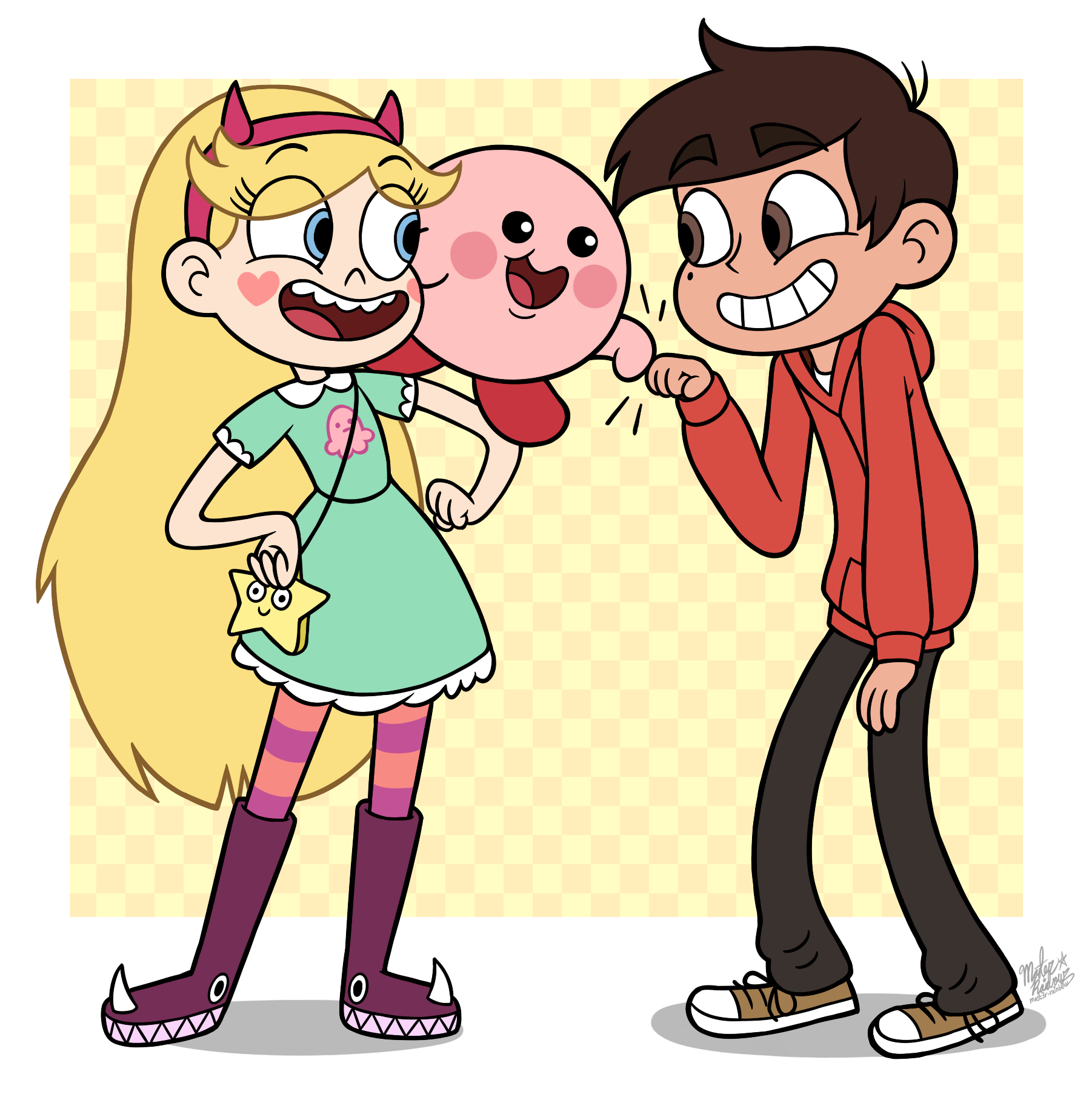 artist_name bare_arms bare_shoulders blonde_hair blue_eyes boots brown_eyes brown_hair crossover facial_mark fist_bump hairband headband heart_cheeks highres kirby kirby_(series) long_hair marco_diaz mast3r-rainb0w nintendo open_mouth pantyhose red_hairband red_headband short_hair signature smile standing star_butterfly star_vs_the_forces_of_evil teeth tongue toon_(style) upper_teeth_only very_long_hair