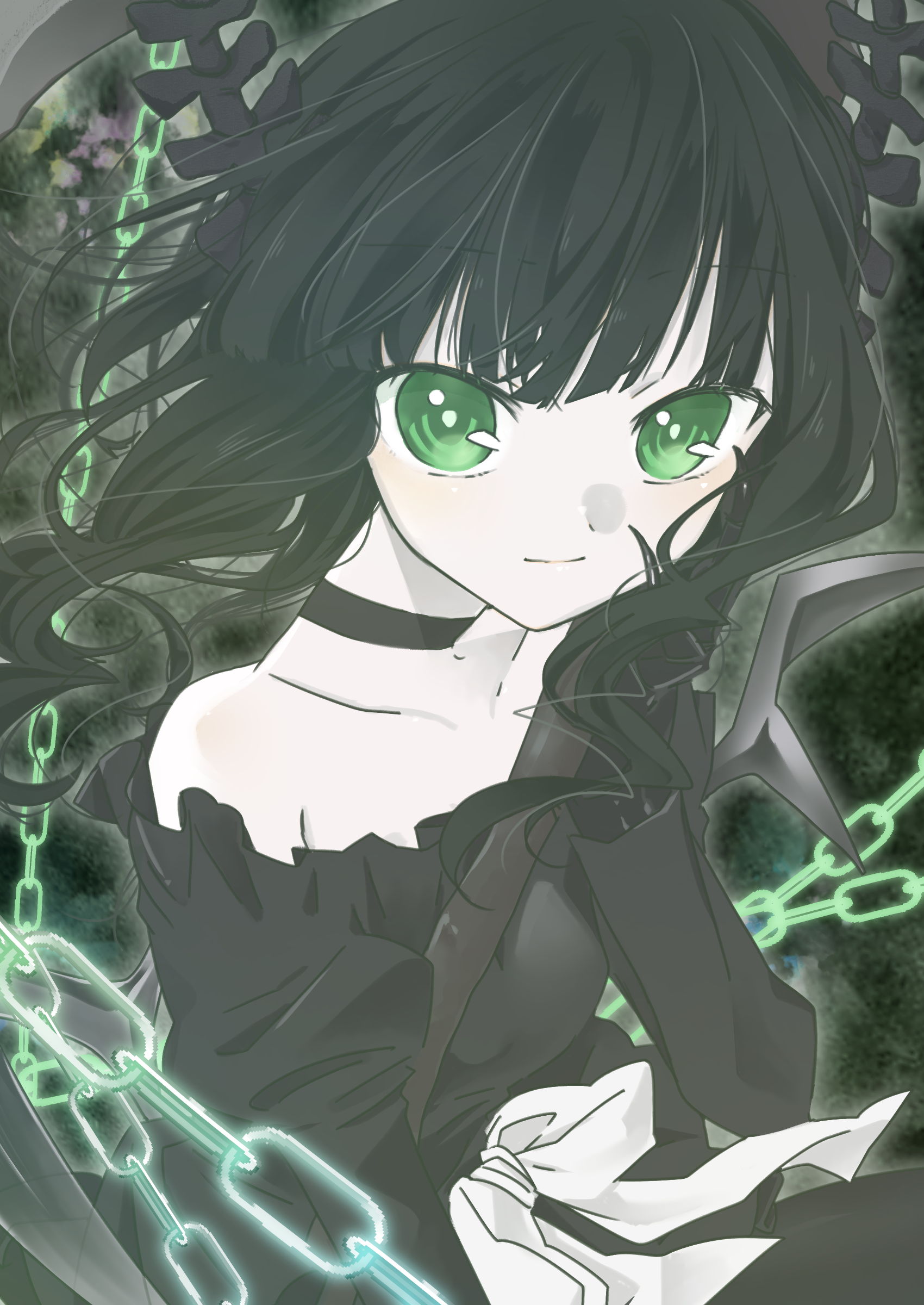 1girl absurdres black_choker black_dress black_hair black_horns black_rock_shooter chain choker dead_master dress green_eyes highres horns looking_at_viewer medium_hair pale_skin skeletal_hand solo user_hzpg8282