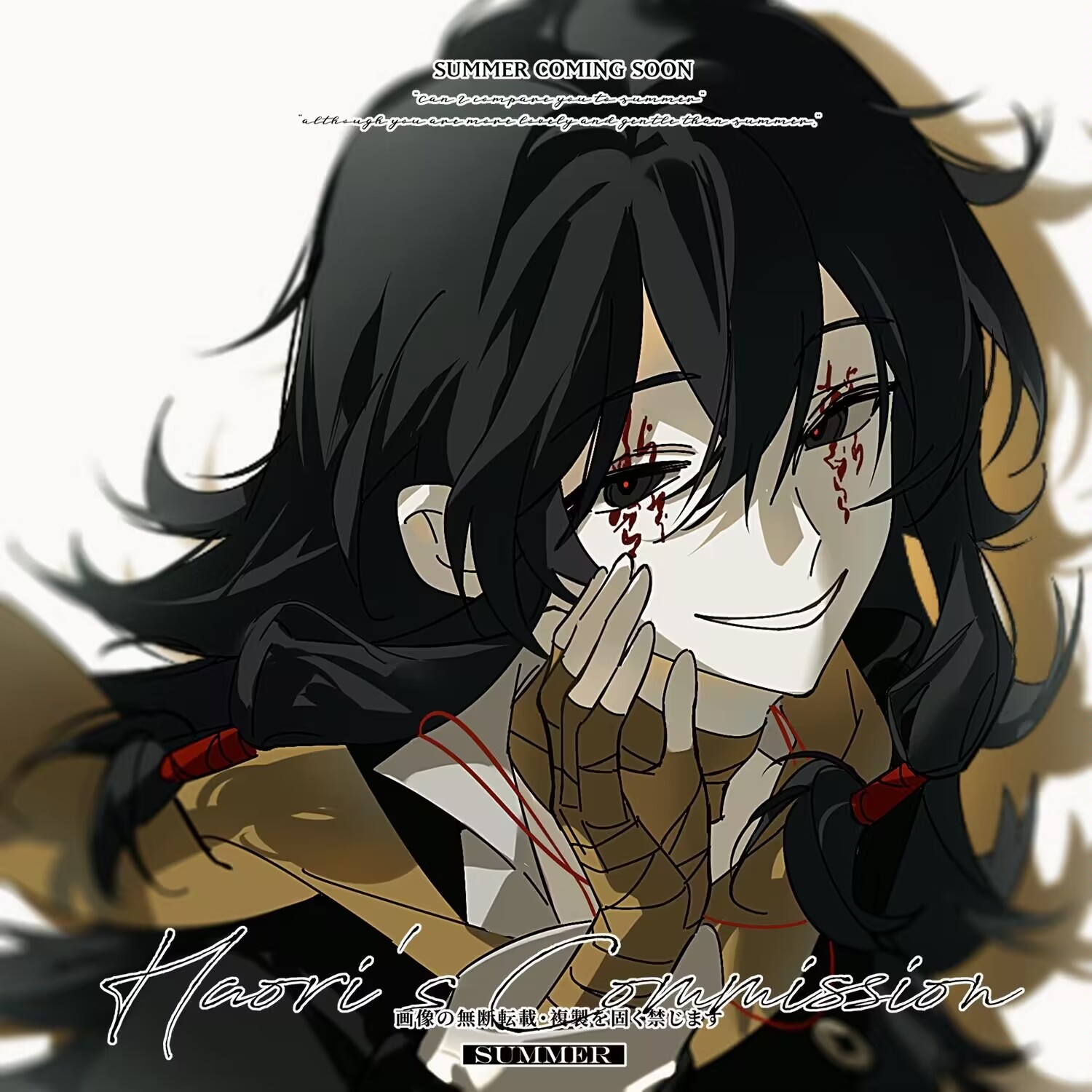 1boy artist_request bandaged_hand bandaged_neck bandages black_eyes black_hair black_jacket chinese_commentary commentary_request commission english_text facial_tattoo hair_between_eyes highres jacket long_hair male_focus open_clothes open_jacket portrait red_pupils scarf second-party_source shirt smile solo tattoo touqi_guaitan watermark white_background white_shirt yellow_scarf ziche_fuzhao