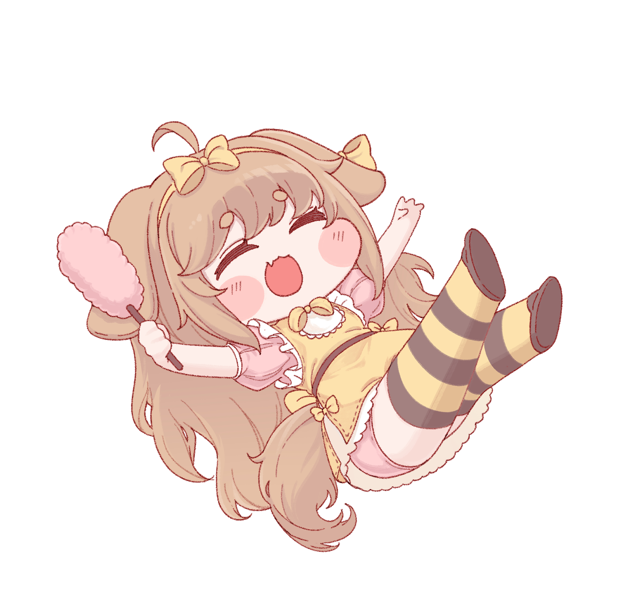 1girl ahoge anavi animal_ears arms_up blush_stickers brown_hair butter_(trickcal) chibi closed_eyes cotton_candy dog_ears dog_girl dog_tail food highres holding holding_cotton_candy holding_food long_hair open_mouth pink_shirt pink_shorts ribbon shirt short_sleeves shorts smile solo striped_clothes striped_thighhighs tail thighhighs trickcal yellow_ribbon yellow_shirt