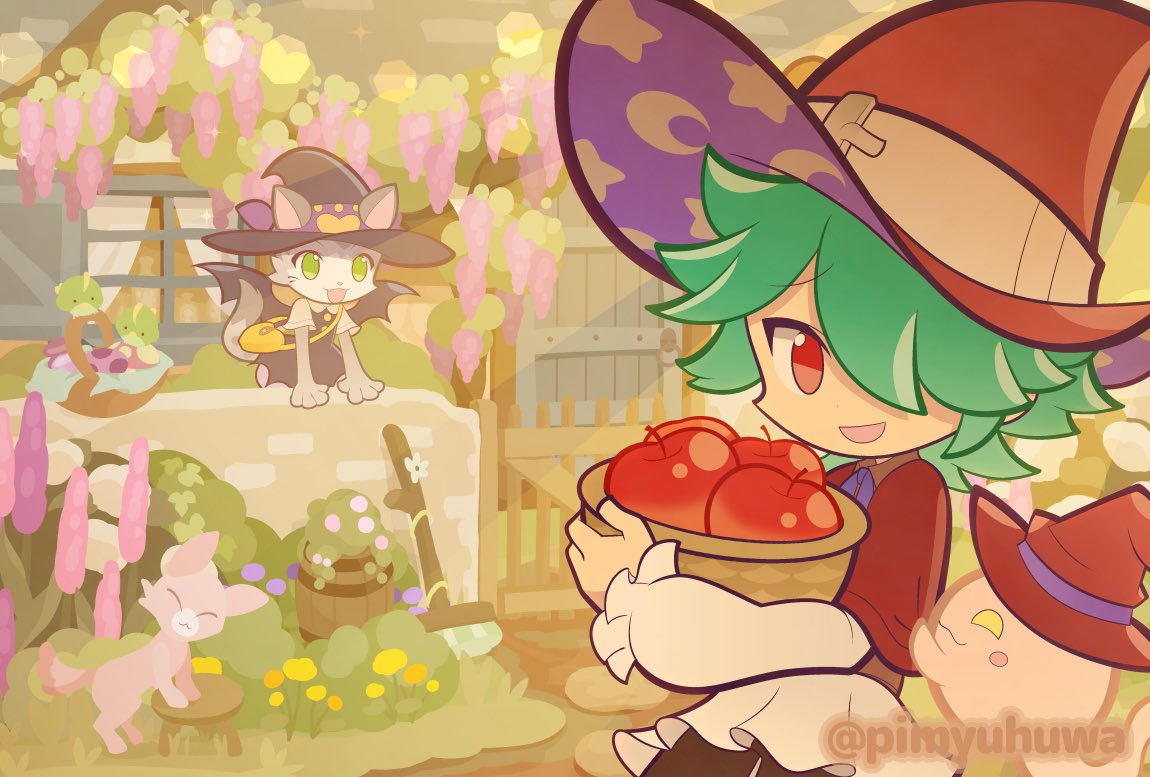 1boy 1girl :d against_wall albert_(puyopuyo) animal apple aqua_hair barrel basket bird black_dress black_hat black_wings brick_wall broom bush cottage_(building) creature day deformed dress egg fence flower foliage food fruit furrowed_brow furry furry_female green_bird green_eyes hair_over_one_eye hand_rest hand_up hat holding holding_basket jpeg_artifacts komone_(puyopuyo) layered_sleeves light_rays long_sleeves male_focus no_lineart no_pupils official_style open_mouth open_window_shutter outdoors overgrown pimyuhuwa puyopuyo puyopuyo_quest apple red_eyes red_hat short_over_long_sleeves short_sleeves smile solo_focus sunbeam sunlight twitter_username window window_shutter wings wisteria witch_hat