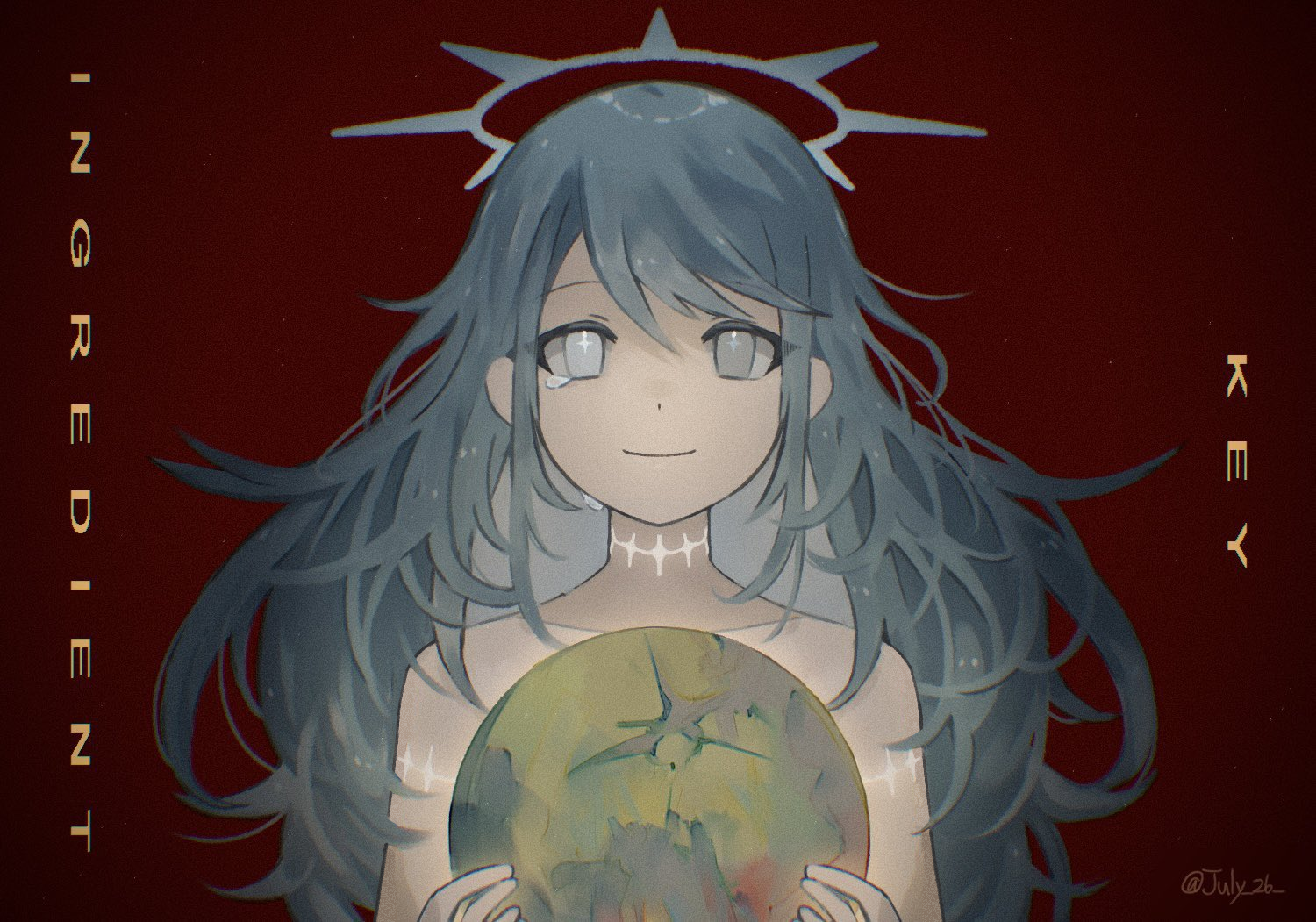 1other album_name androgynous blue_hair closed_mouth collarbone glowing glowing_eye halo holding long_hair looking_at_viewer mili_(band) ooya_(july_26) orb other_focus red_background sidelocks signature single_tear smile solo straight-on topless_other torino_(mili) upper_body very_long_hair vignetting white_eyes