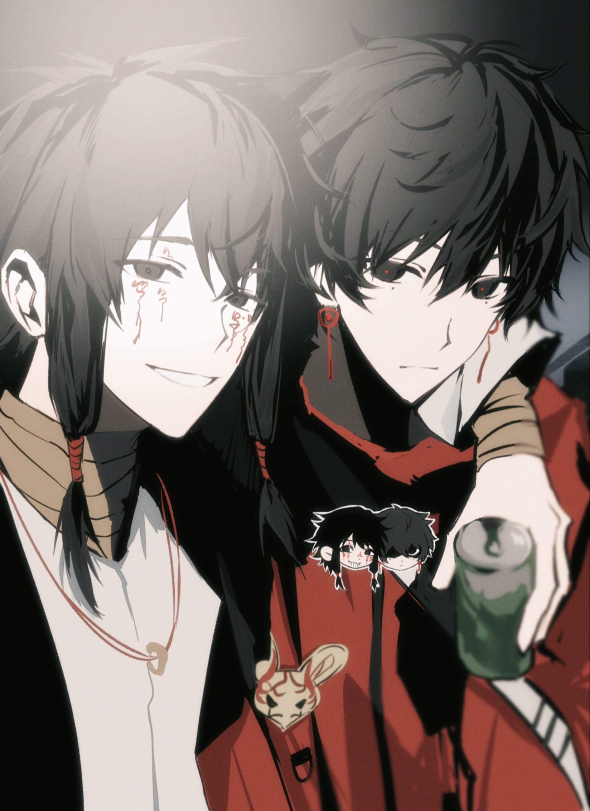 2boys absurdres arm_around_shoulder bandaged_arm bandaged_neck bandages black_eyes black_hair black_jacket can chinese_commentary closed_mouth commentary_request earrings facial_tattoo grin hair_between_eyes highres holding holding_can jacket jewelry li_yuting_(male) male_focus multiple_boys open_clothes open_jacket red_jacket red_pupils shirt short_hair short_hair_with_long_locks smile tattoo timedown touqi_guaitan white_shirt ziche_fuzhao