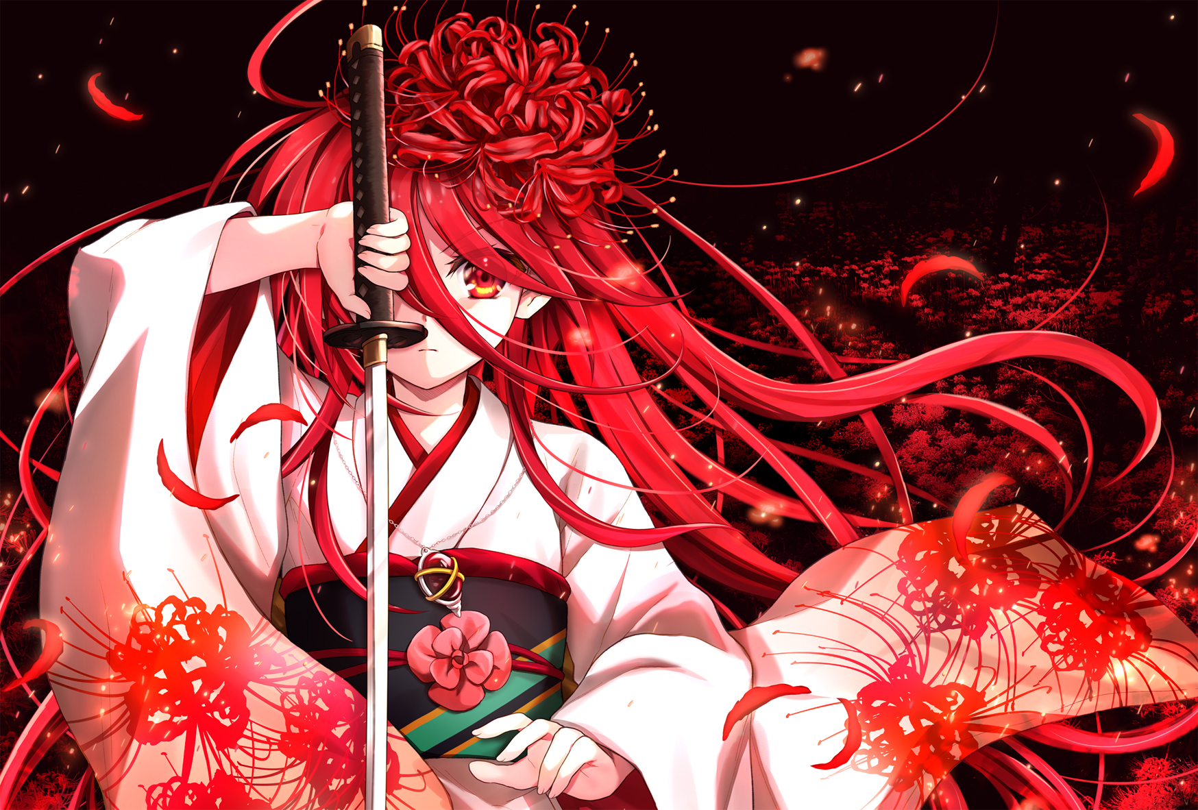 1girl arm_up closed_mouth commentary_request flower hair_flower hair_ornament highres holding holding_sword holding_weapon japanese_clothes katana kimono long_hair long_sleeves looking_at_viewer obi petals red_eyes red_flower red_hair sash shakugan_no_shana shana solo spider_lily sword tachitsu_teto v-shaped_eyebrows very_long_hair weapon white_kimono wide_sleeves