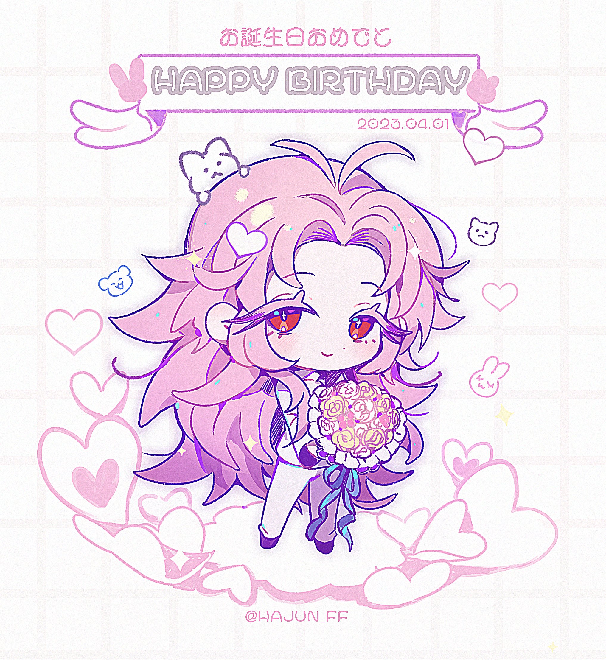 1boy antenna_hair bilingual_text black_shoes bouquet chibi chibi_only closed_mouth colored_eyelashes commentary_request english_text flower fluffy_hair hajun_(hey_sangha) happy_birthday hatsutori_hajime heart highres holding holding_bouquet korean_commentary korean_text long_hair long_sleeves male_focus mixed-language_text pants pink_hair red_eyes saibou_shinkyoku shirt shoes smile solo twitter_username white_pants white_shirt