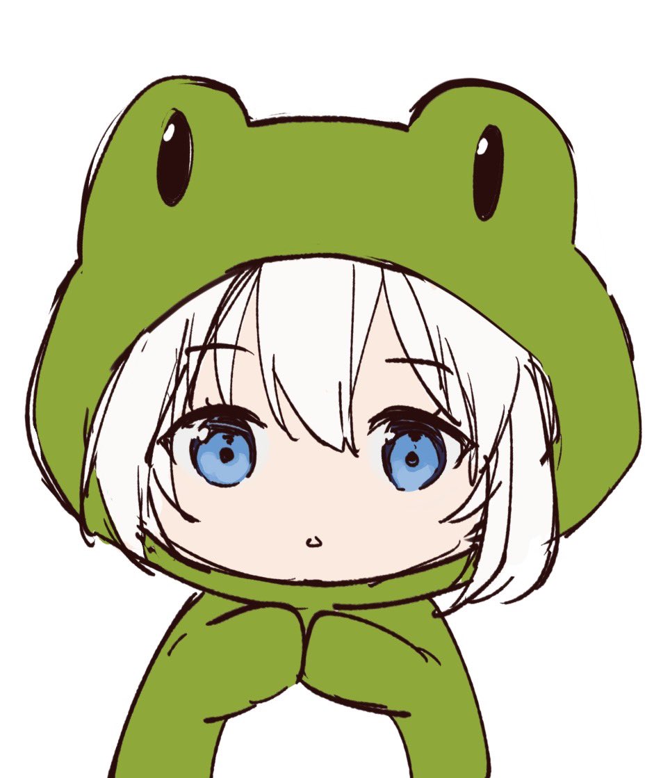 1girl animal_costume animal_hood blue_eyes chibi commentary_request frog_costume frog_hood grey_hair hair_between_eyes hood hood_up looking_at_viewer mochizuki_shiina original parted_lips simple_background solo upper_body white_background