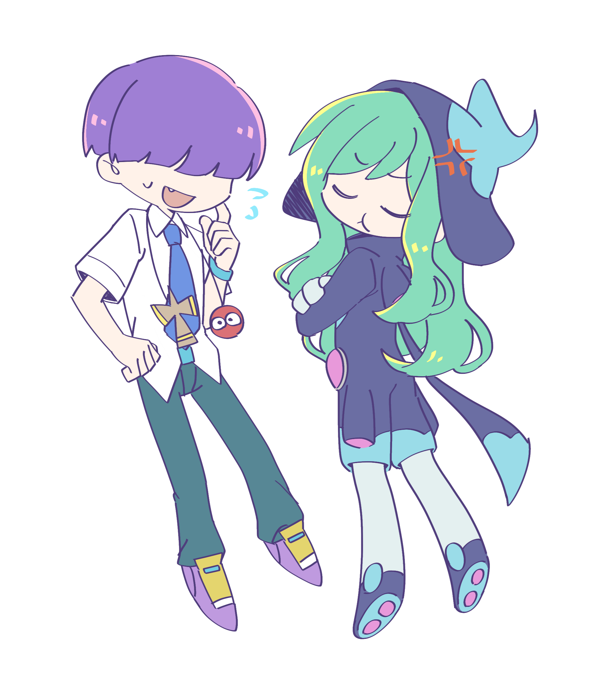 2boys :t anger_vein aqua_hair arm_at_side black_footwear black_hat black_unitard blue_necktie blunt_bangs closed_eyes closed_mouth collared_shirt colored_skin crossed_arms deformed ecolo_(puyopuyo) facing_another facing_to_the_side fang finger_to_cheek flat_color floating from_behind full_body gloves green_pants hair_over_eyes hat highres inotaso long_bangs long_hair long_sleeves male_focus multicolored_footwear multiple_boys necktie open_mouth pants pantyhose purple_footwear purple_hair puyopuyo sasaki_maguro scratching_cheek shirt short_hair short_sleeves simple_background sweatdrop swept_bangs untucked_shirt unusual_ecolo very_long_hair wavy_hair white_background white_gloves white_pantyhose white_shirt white_skin wing_collar
