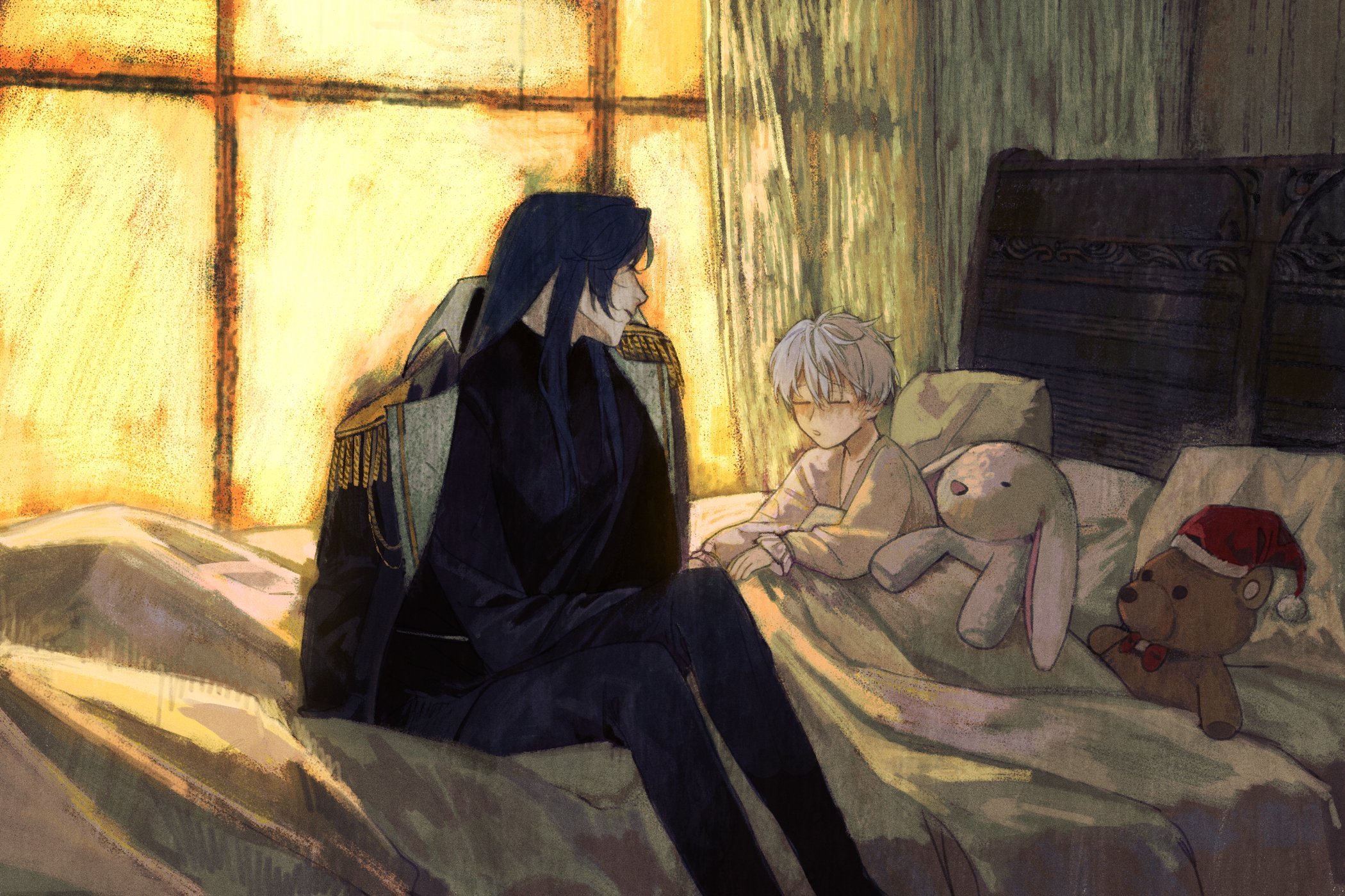 2boys antropy bedroom black_coat blue_hair blue_pants blue_shirt bow bowtie character_request child closed_eyes coat coat_on_shoulders collarbone collared_coat commentary curtains day english_commentary epaulettes feet_out_of_frame frilled_sleeves frills grey_hair hair_between_eyes hat highres indoors lapels light_blush long_hair long_sleeves looking_at_another mahoutsukai_no_yakusoku male_focus multiple_boys notched_lapels on_bed open_mouth pale_skin pants pillow puffy_long_sleeves puffy_sleeves red_bow red_bowtie santa_hat shirt short_hair sidelocks sitting sleeves_past_wrists straight_hair stuffed_animal stuffed_rabbit stuffed_toy teddy_bear under_covers v-neck white_shirt window