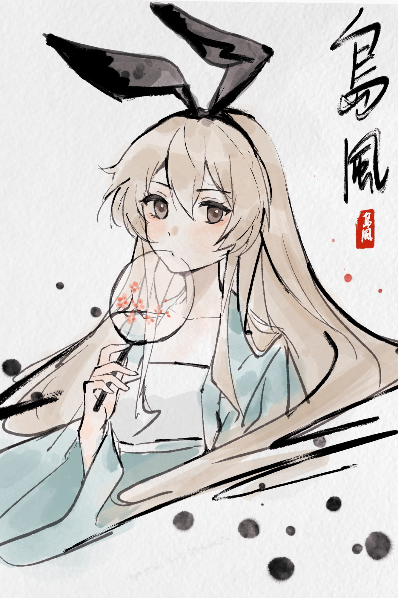 1girl animal_ears blonde_hair brown_eyes chinese_clothes duijin_ruqun hand_fan hanfu highres ink_wash_painting kantai_collection long_hair looking_at_viewer noriii paper_fan rabbit_ears shimakaze_(kancolle) solo tuanshan uchiwa