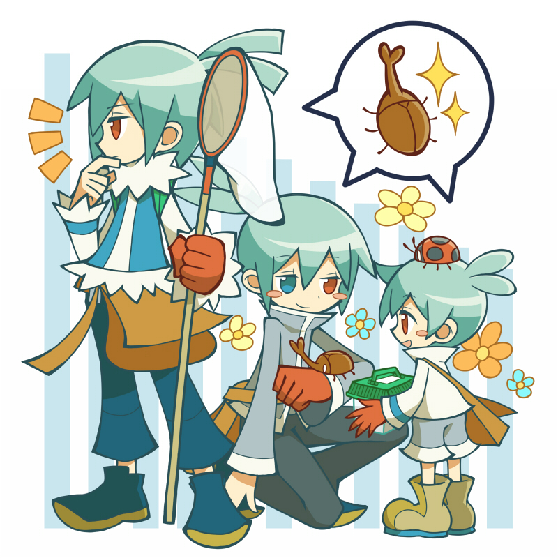 3boys age_comparison age_difference animal animal_on_arm animal_on_head antenna_hair aqua_hair bag beetle black_pants blue_coat blue_eyes blue_footwear blue_pants blush_stickers boots box brown_bag brown_footwear bug child closed_mouth coat dadada_(dadadanoda) deformed finger_to_own_chin flower_symbol full_body fur_collar grey_coat grey_shorts holding holding_box insect male_focus mega_sig messenger_bag mini_sig multiple_boys multiple_persona notice_lines official_style on_head on_one_knee open_mouth oversized_limbs pants puyopuyo puyopuyo_7 red_eyes shared_speech_bubble shoes short_hair shorts shoulder_bag sig_(puyopuyo) smile speech_bubble spoken_animal standing terrarium time_paradox white_coat