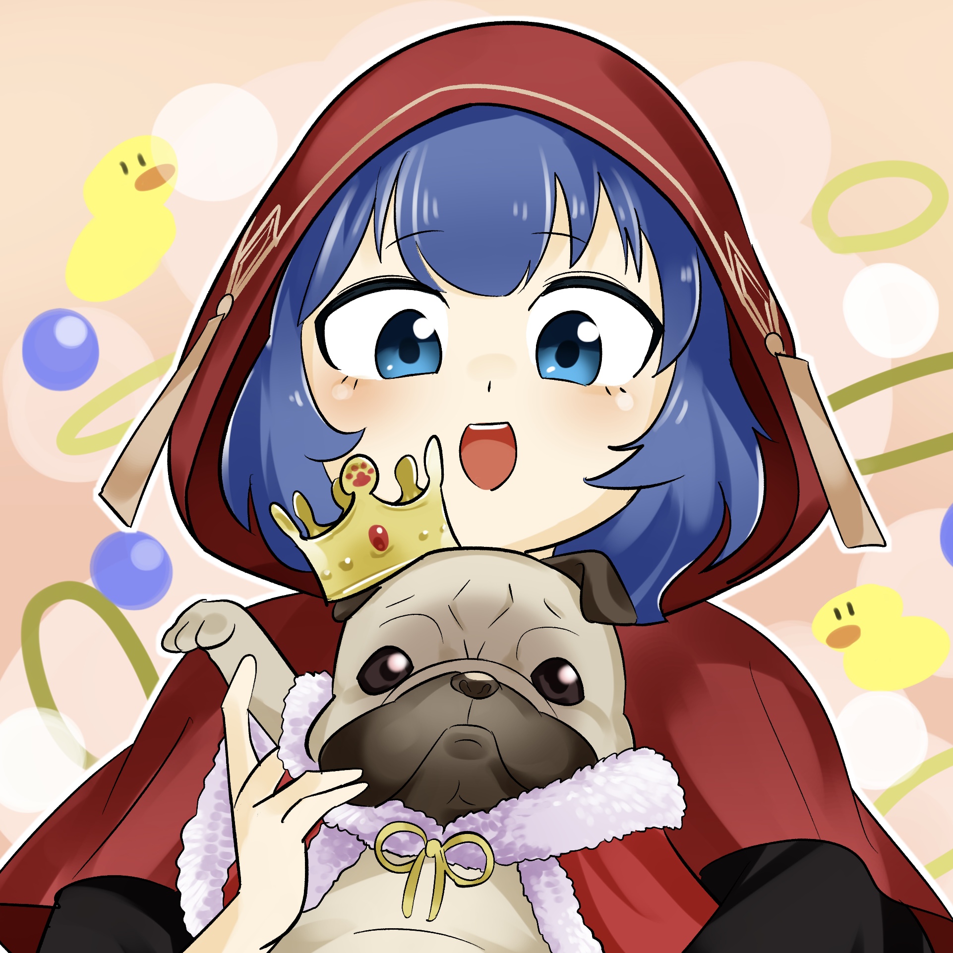 1girl animal blue_eyes blue_hair cape crown dog duel_monster highres holding holding_animal lo_the_prayers_of_the_voiceless_voice principug pug red_robe robe sawan_cutman smile solo yu-gi-oh!