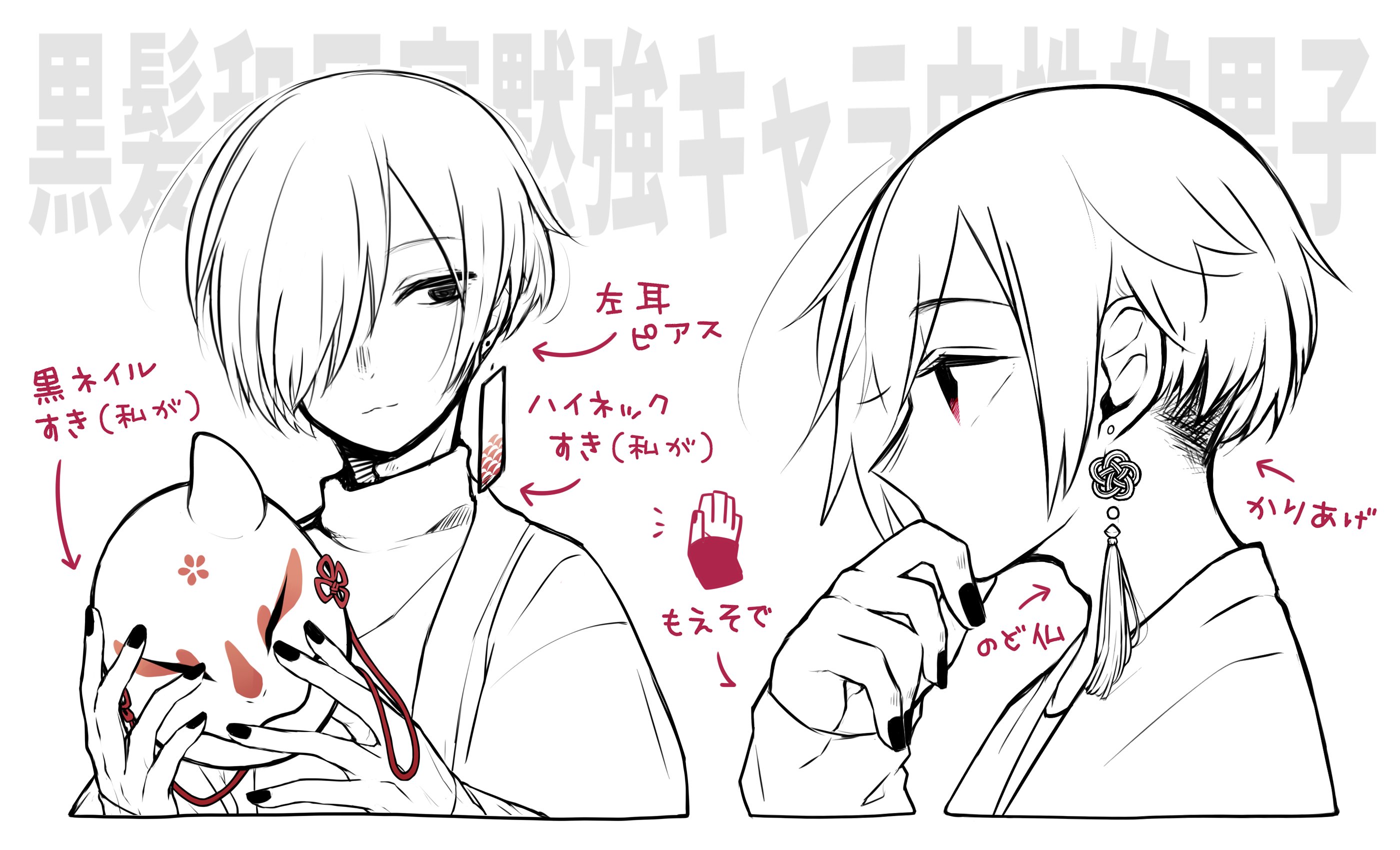 1boy black_eyes black_nails copyright_request earrings from_side hair_over_one_eye highres holding holding_mask japanese_clothes jewelry kimono long_sleeves male_focus mask mee_(mee0118) nail_polish profile short_hair spot_color sweater translation_request unworn_mask white_background