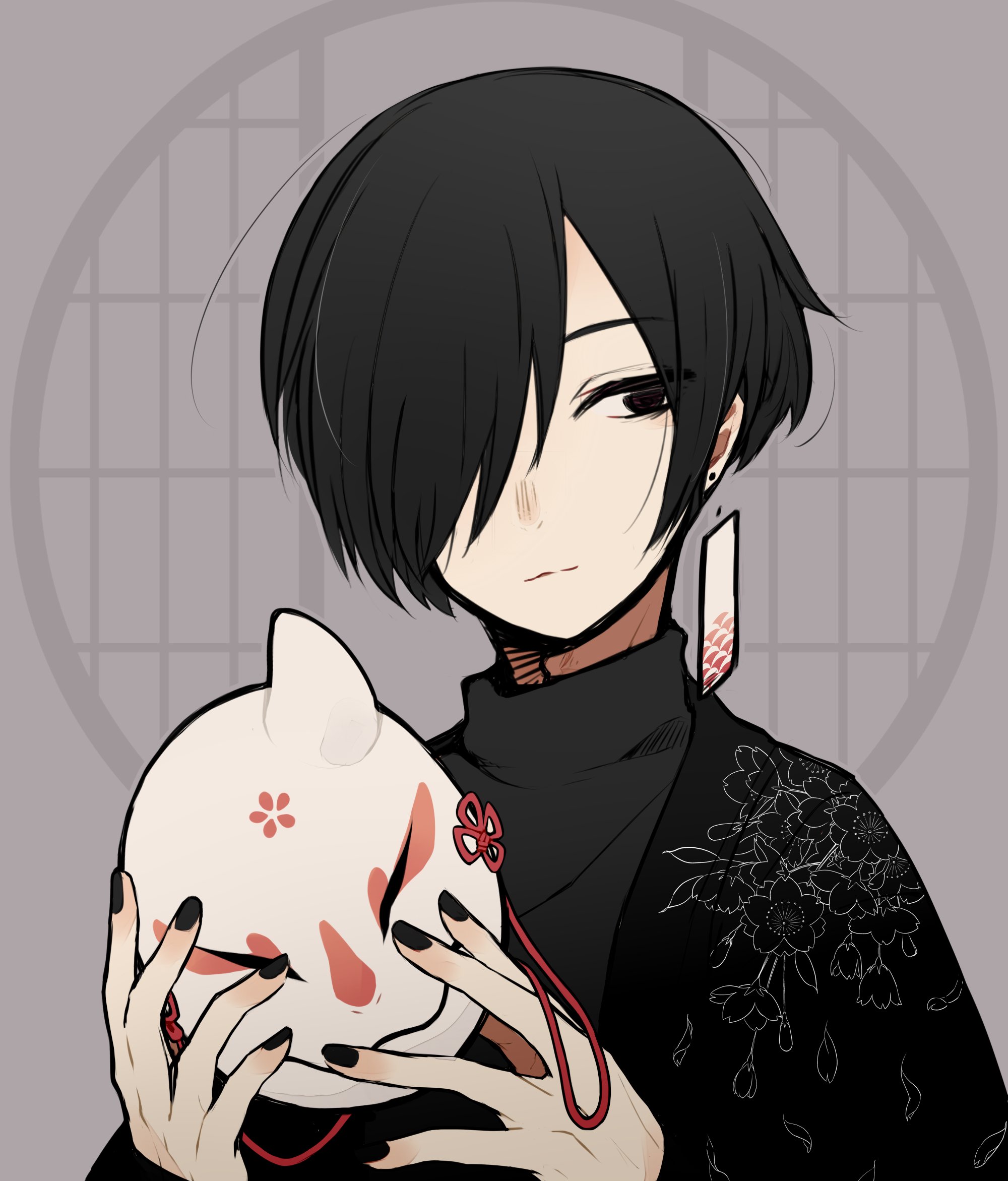 1boy black_eyes black_hair black_sweater copyright_request earrings floral_print floral_print_kimono grey_background hair_over_one_eye highres holding holding_mask jewelry light_smile male_focus mask mee_(mee0118) print_kimono short_hair solo sweater unworn_mask