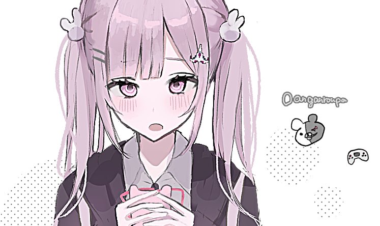 1girl :o alternate_hairstyle black_jacket blush collared_shirt copyright_name danganronpa_(series) danganronpa_2:_goodbye_despair hair_ornament jacket long_hair monokuma nanami_chiaki neck_ribbon open_clothes open_jacket own_hands_together pink_eyes portrait rabbit_hair_ornament ribbon shima_(fm_90mhz) shirt twintails white_background