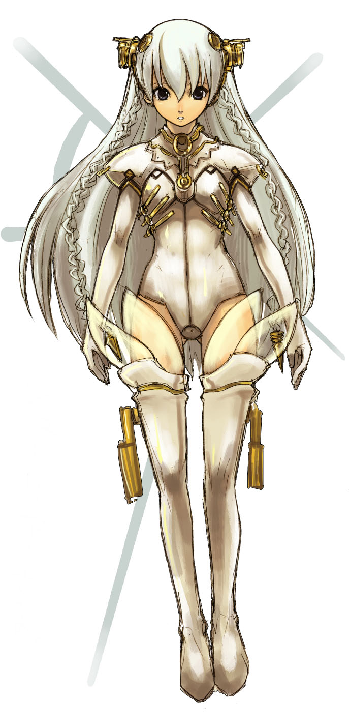 00s 1girl ar_tonelico ar_tonelico_i blue_eyes boots braid female_focus flat_chest full_body gloves grey_eyes gust hair_ornament headgear highres leotard long_hair long_image looking_at_viewer parted_lips see-through_clothes shurelia_(ar_tonelico) sketch solo standing tall_image tetsu_(kimuchi) thigh_boots thighhighs turtleneck twin_braids white_background white_boots white_gloves white_hair