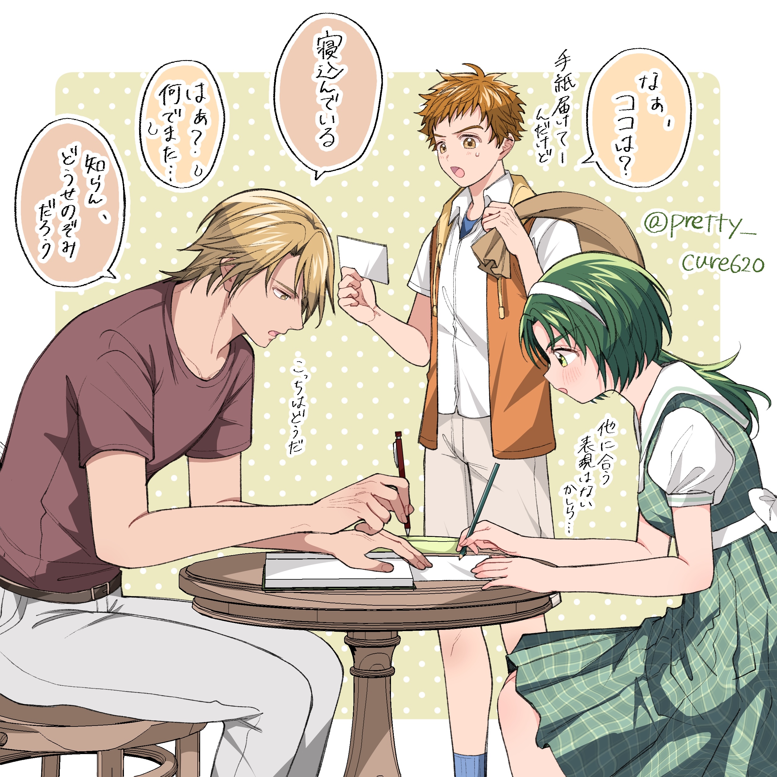1girl 2boys absurdres akimoto_komachi amai_shirou belt blonde_hair blue_shirt blue_socks blush brown_belt brown_eyes brown_hair chair checkered_clothes checkered_dress denim dress dress_shirt green_dress green_eyes green_hair grey_pants hairband highres holding hood hooded_jacket jacket jeans kibou_no_chikara_otona_precure_'23 multiple_boys natsu_(precure) non_(pretty_cure620) notebook nuts_(precure) open_mouth pants paper pen pencil precure red_shirt sack shirt short_hair short_sleeves side_ponytail sitting sleeveless sleeveless_jacket socks syrup_(precure) table twitter_username white_hairband white_shirt yellow_jacket yes!_precure_5 yes!_precure_5_gogo!