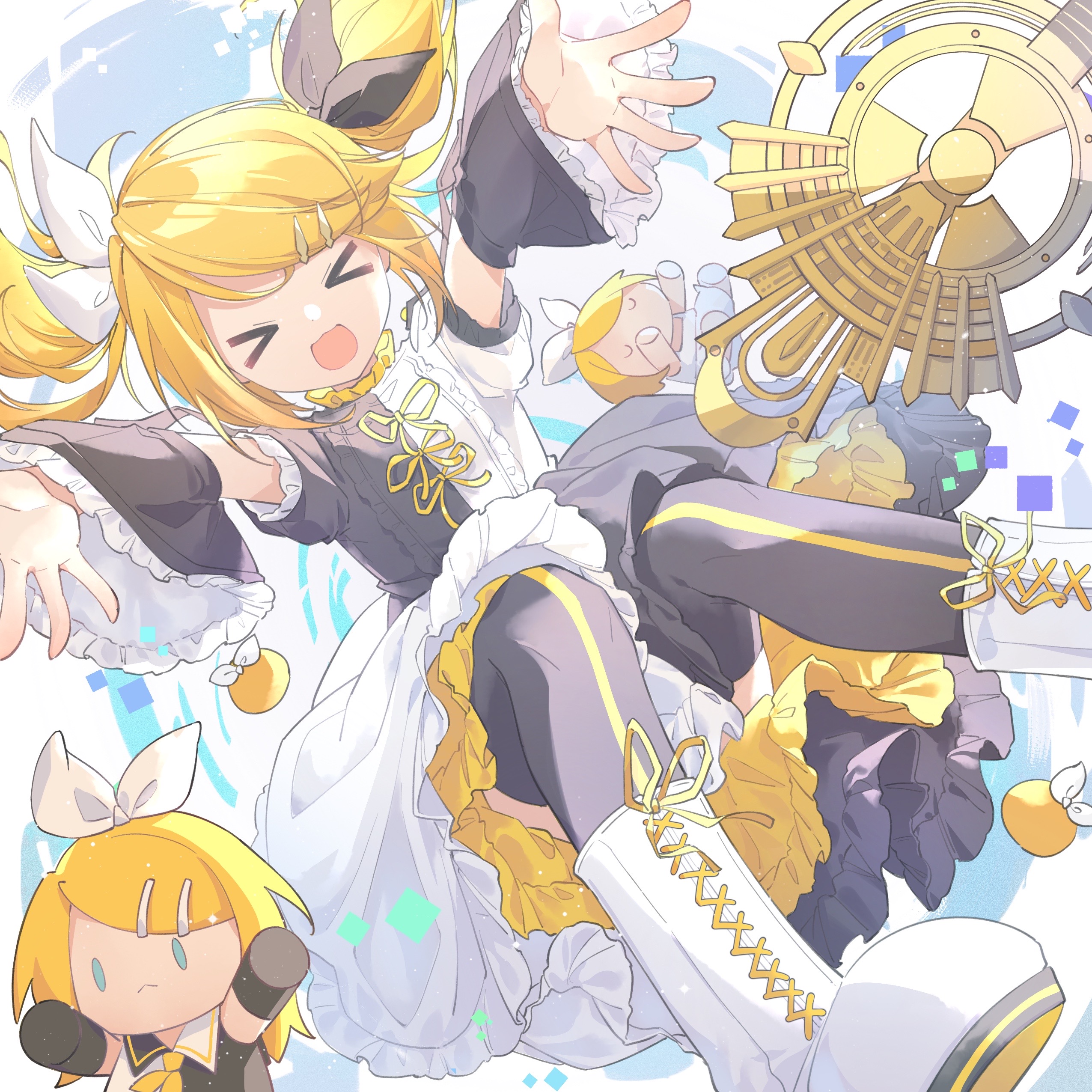 >_< 1girl absurdres alternate_hairstyle bass_guitar blonde_hair boots chaji_xiao_bai character_doll detached_sleeves doll dress frills guitar hair_ornament hair_ribbon hairclip highres instrument kagamine_rin kagamine_rin_(reactor) open_mouth reaching ribbon roshin_yuukai_(vocaloid) smile thighhighs twintails vocaloid