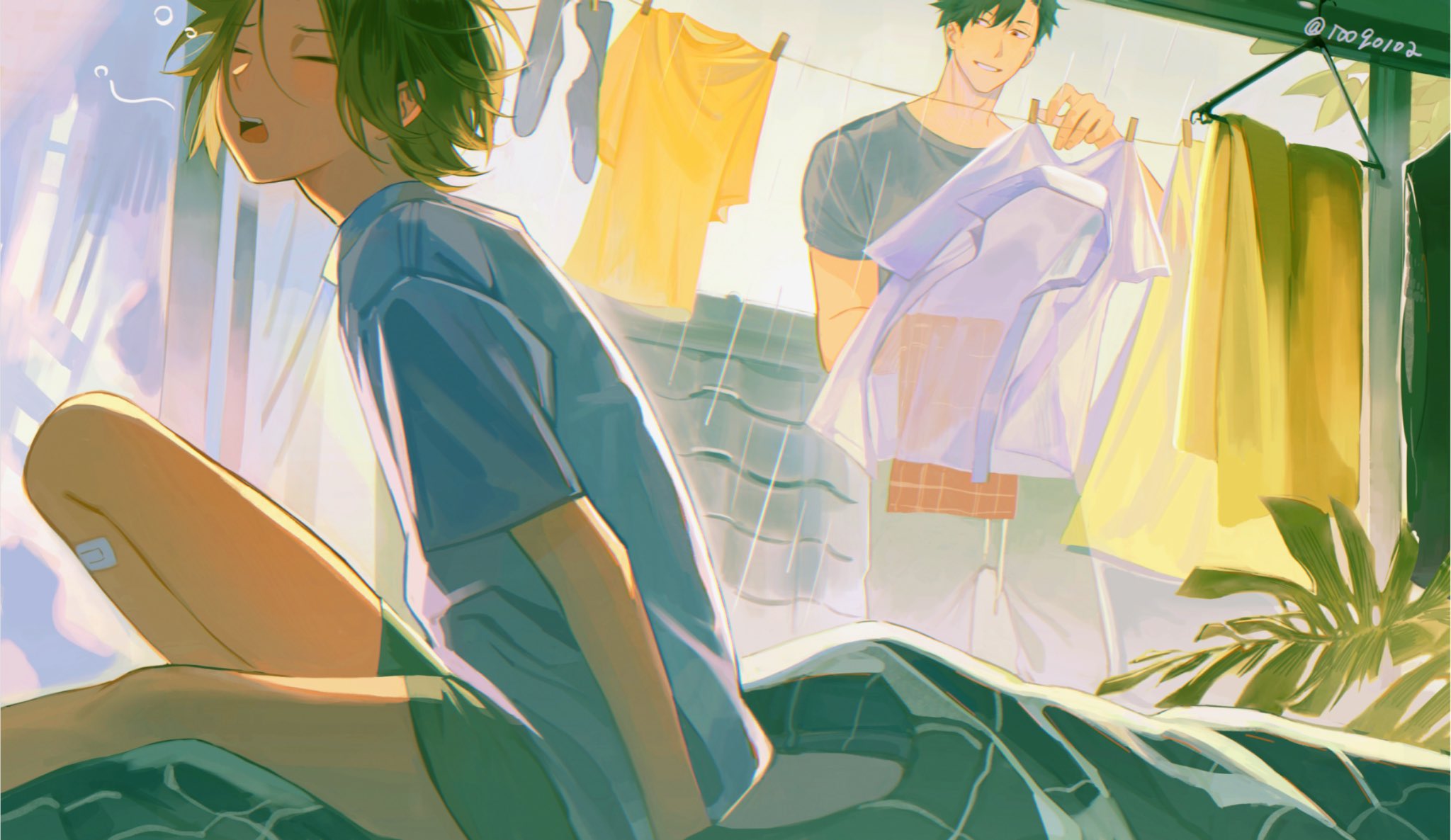 2boys arm_support arm_up bandaid bandaid_on_leg bed_sheet black_hair black_shirt blonde_hair closed_eyes clothes_pin clothesline commentary crew_neck curtains drawstring haikyuu!! hair_between_eyes hanging_on_clothesline highres indoors knee_up kozume_kenma kuroo_tetsurou looking_at_another male_focus messy_hair multicolored_hair multiple_boys open_mouth outstretched_leg pants plant rain red_eyes rooq0102 shirt short_sleeves sky smile sweatpants teeth tongue twitter_username two-tone_hair unworn_clothes upper_teeth_only white_shirt yawning