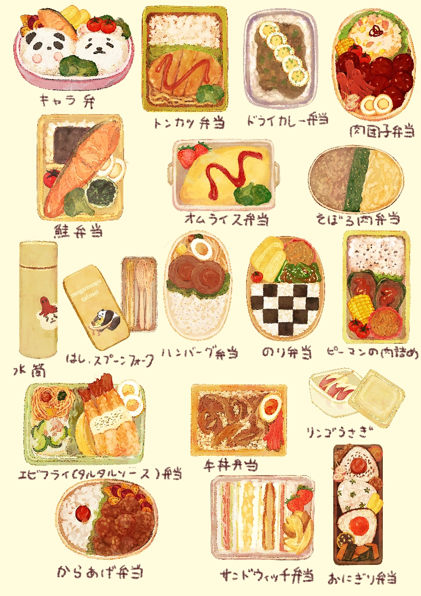 bento commentary_request dezitarukinngyo egg food food_art food_focus katsu_(food) kyaraben meat meatball no_humans original rice salmon simple_background tagme translation_request yellow_background