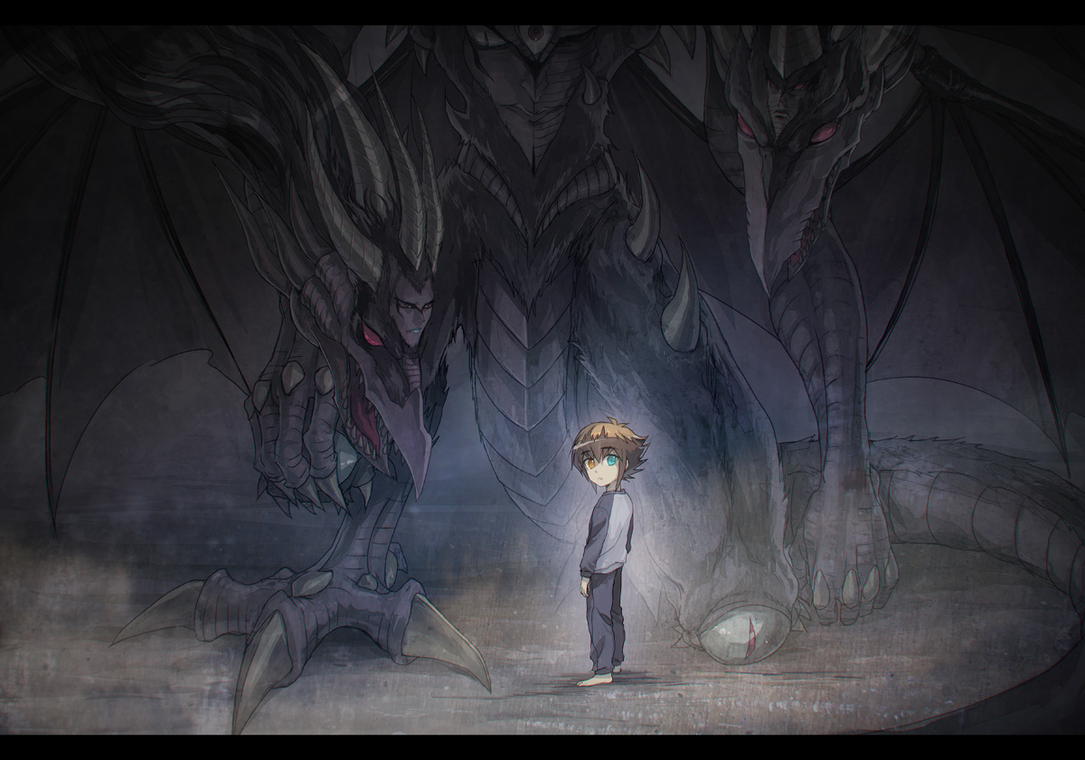 aged_down barefoot blue_pants blue_shirt brown_hair demon_tail demon_wings duel_monster facing_to_the_side green_eyes grey_background heterochromia looking_at_viewer moribuden on_one_knee open_mouth outdoors pajamas pants red_eyes shirt tail wings yellow_eyes yu-gi-oh! yu-gi-oh!_gx yubel yubel_-_the_ultimate_nightmare yuki_judai