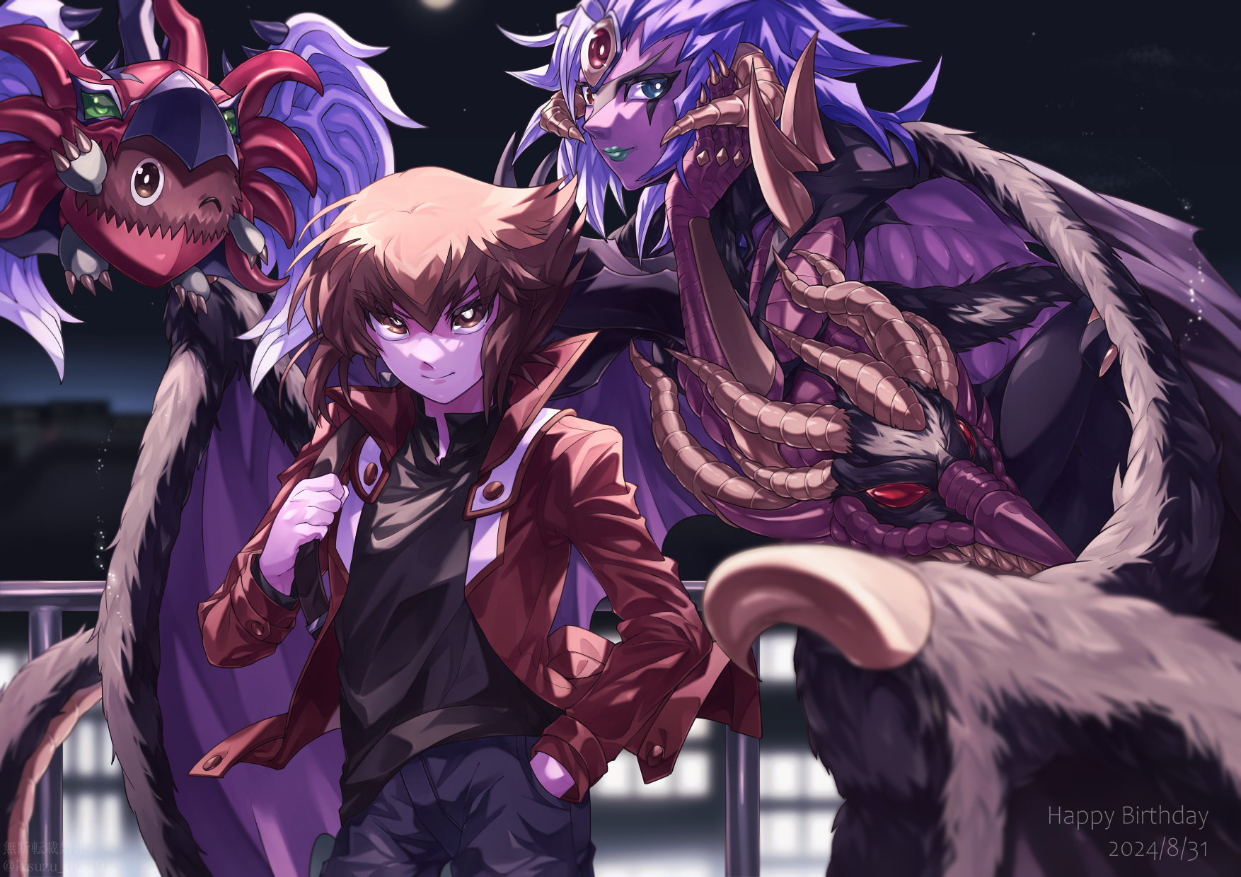 1boy 1other aqua_lips black_shirt blue_pants blurry blurry_foreground body_fur brown_eyes brown_fur brown_hair colored_sclera colored_skin demon_wings denim duel_academy_uniform_(yu-gi-oh!_gx) green_eyes grey_hair hand_in_pocket happy_birthday heterochromia highres jacket kisuzu_th319 medium_hair multicolored_hair orange_eyes pants purple_skin red_eyes red_jacket shirt third_eye two-tone_hair white_wings winged_kuriboh wings yellow_sclera yu-gi-oh! yu-gi-oh!_gx yubel yuki_judai