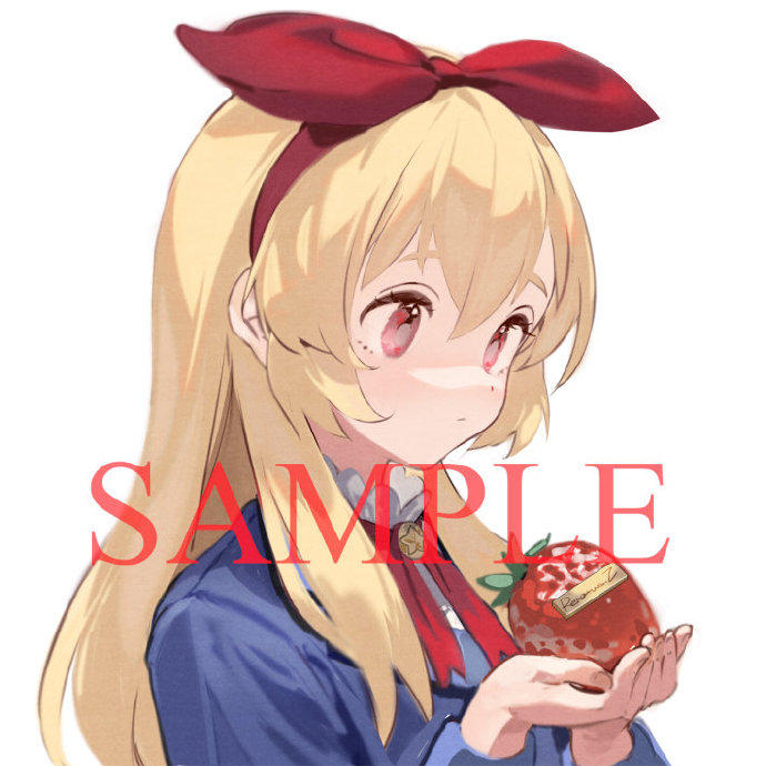 1girl bad_id bad_weibo_id blonde_hair blue_jacket bow closed_mouth collared_shirt dot_nose expressionless eyelashes fingernails food frilled_shirt_collar frills fruit hair_between_eyes hair_bow hairband high_collar holding holding_food holding_fruit jacket light_blush long_hair neck_ribbon original own_hands_together red_bow red_eyes red_hairband red_ribbon ribbon sample_watermark shirt sidelocks simple_background solo star_(symbol) strawberry tareme upper_body very_long_hair watermark white_background white_shirt xiao_chichi