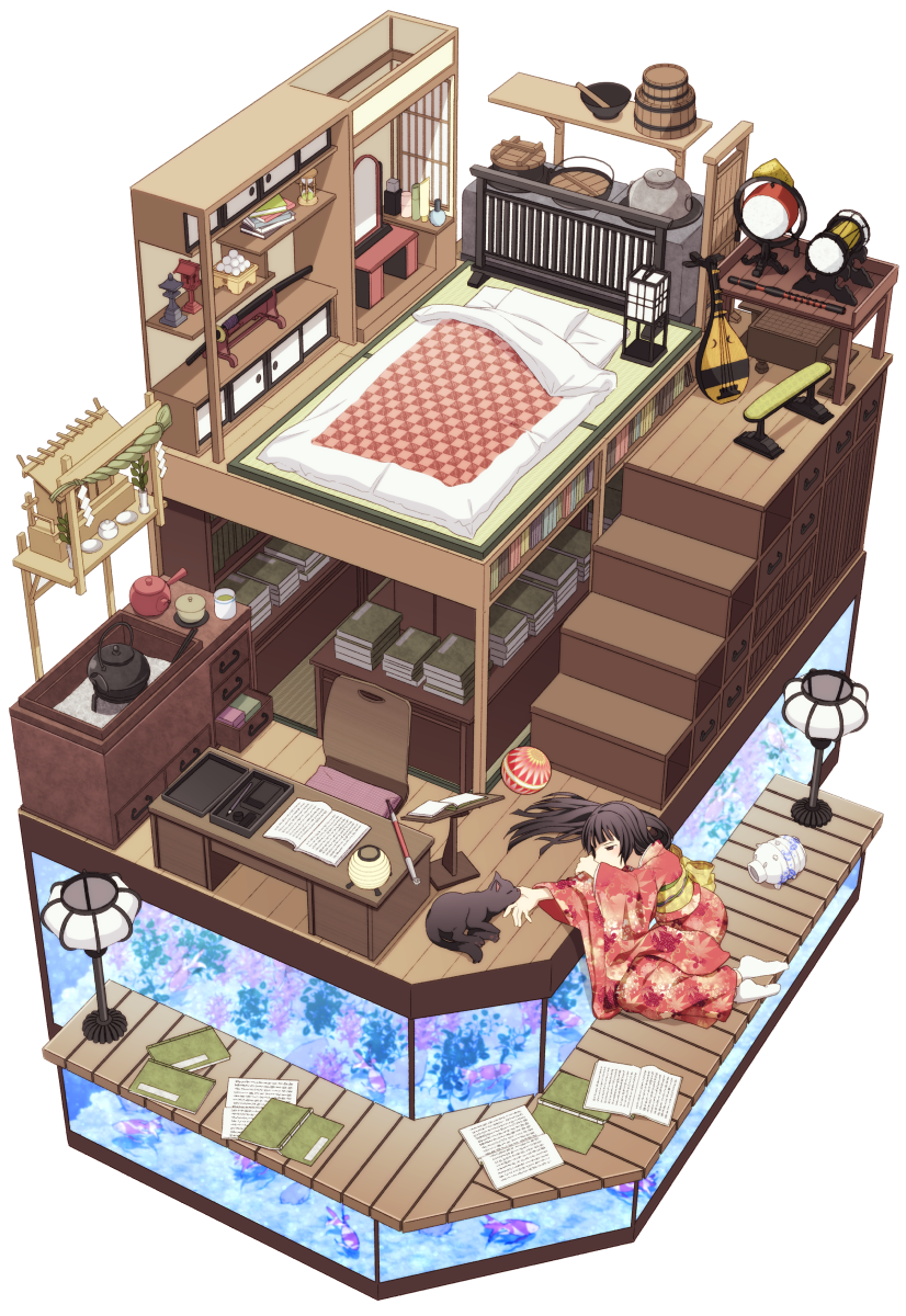 1girl bed bench biwa_lute black_cat black_hair book cat chair checkered_blanket commentary_request desk fish floorplan highres hourglass instrument itou_(mogura) japanese_clothes katana kimono lamp long_hair lute_(instrument) original pillow red_kimono simple_background socks solo stairs study_(room) sword weapon white_background white_socks