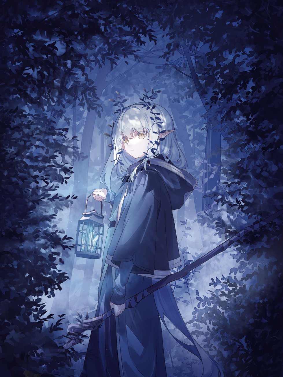 1girl crystal elf eyes_visible_through_hair forest highres holding holding_lantern holding_staff hood hood_down lantern leaf leaf_on_head long_hair looking_at_viewer nature nekoln night original outdoors pointy_ears robe solo staff white_hair yellow_eyes