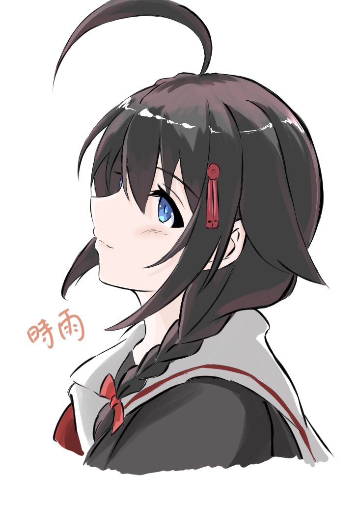 1girl ahoge black_hair black_serafuku blue_eyes braid hair_flaps hair_ornament hair_over_shoulder kantai_collection long_hair sailor_collar school_uniform serafuku shigure_(kancolle) shigure_kai_ni_(kancolle) simple_background single_braid solo takechi_(yamato_kure_46) upper_body white_background white_sailor_collar