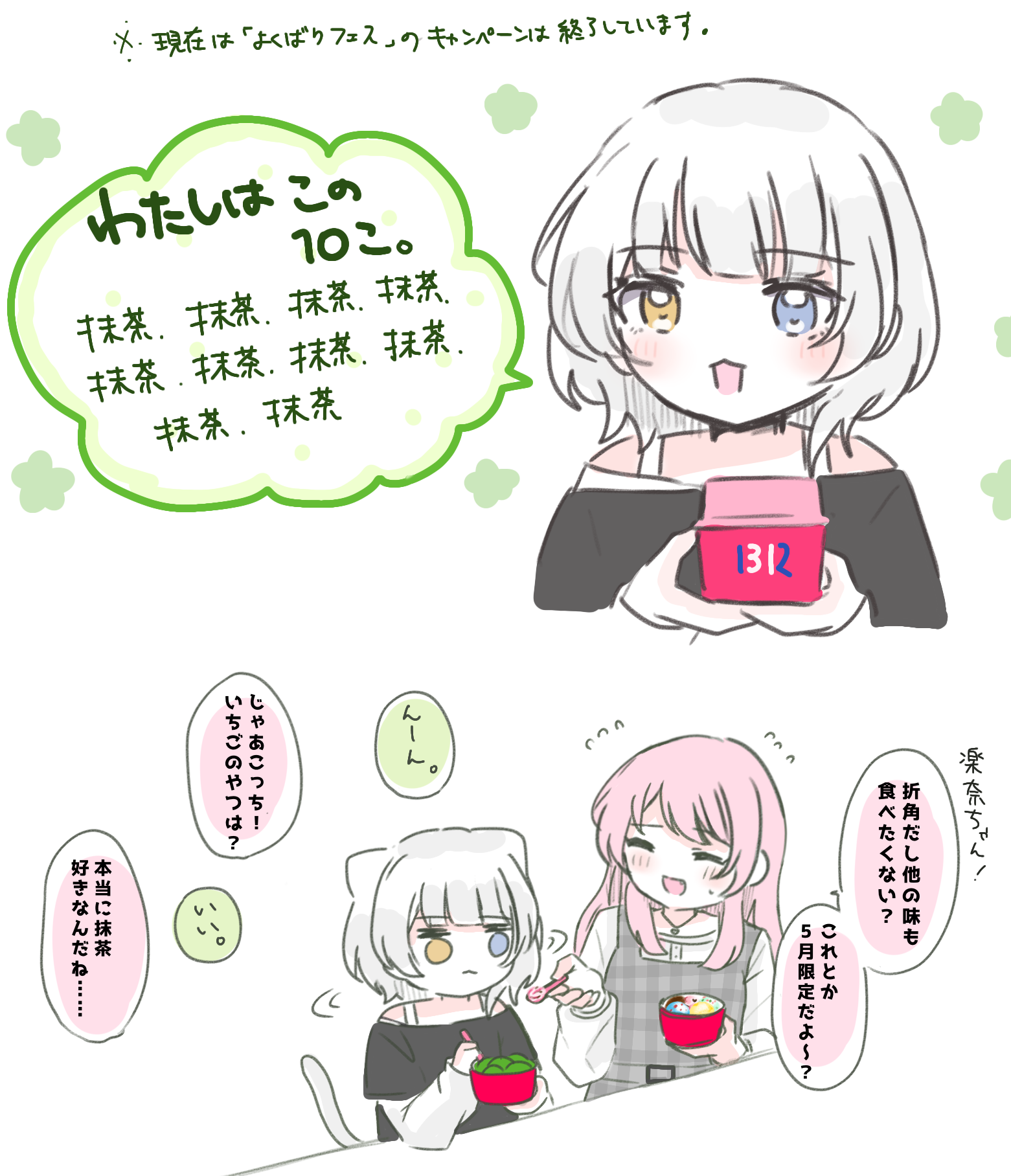 2girls :3 =_= ^_^ animal_ears asahi_rise bang_dream! bang_dream!_it's_mygo!!!!! baskin-robbins black_shirt blue_eyes blush cat_ears cat_girl cat_tail chihaya_anon closed_eyes closed_mouth commentary_request dress fang food grey_dress grey_eyes heterochromia highres holding holding_spoon ice_cream kaname_raana kemonomimi_mode long_hair matcha_(food) multiple_girls open_mouth partial_commentary pinafore_dress pink_hair plaid_clothes plaid_dress shaking_head shirt short_hair sleeveless sleeveless_dress spoon tail translation_request white_hair white_shirt yellow_eyes