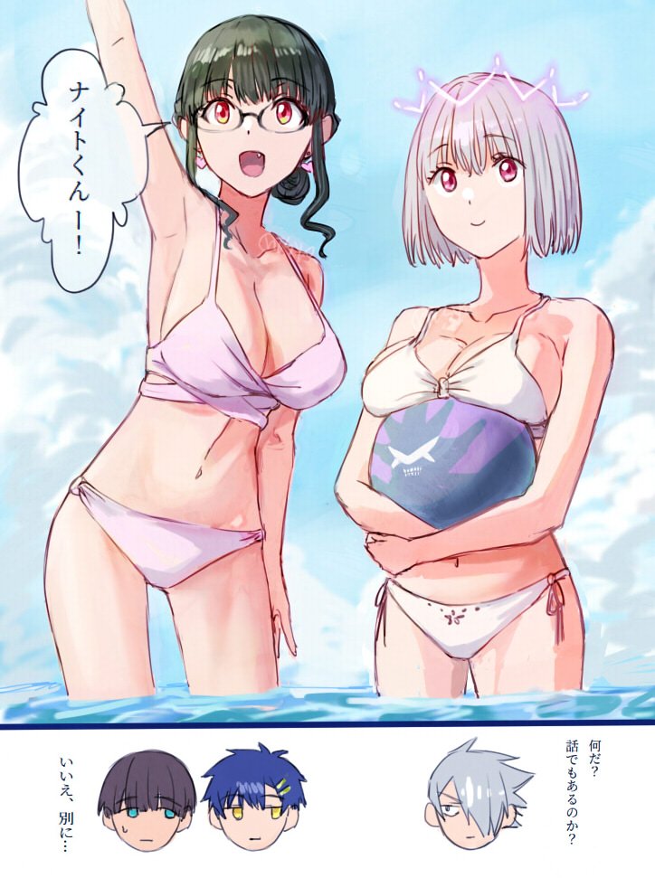 1girl 2girls 3boys anosillus_ii anti_(ssss.gridman) asanaka_yomogi ball beach beachball bikini black_hair blue_eyes blue_hair blue_sky breasts brown_hair cloud glasses gridman_universe gridman_universe_(movie) hair_ornament holding holding_ball holding_beachball large_breasts long_hair multiple_boys multiple_girls ocean outdoors purple_bikini purple_hair red_eyes risyo shinjou_akane shinjou_akane_(new_order) short_hair sky smile swimsuit water white_bikini yamanaka_koyomi yellow_eyes