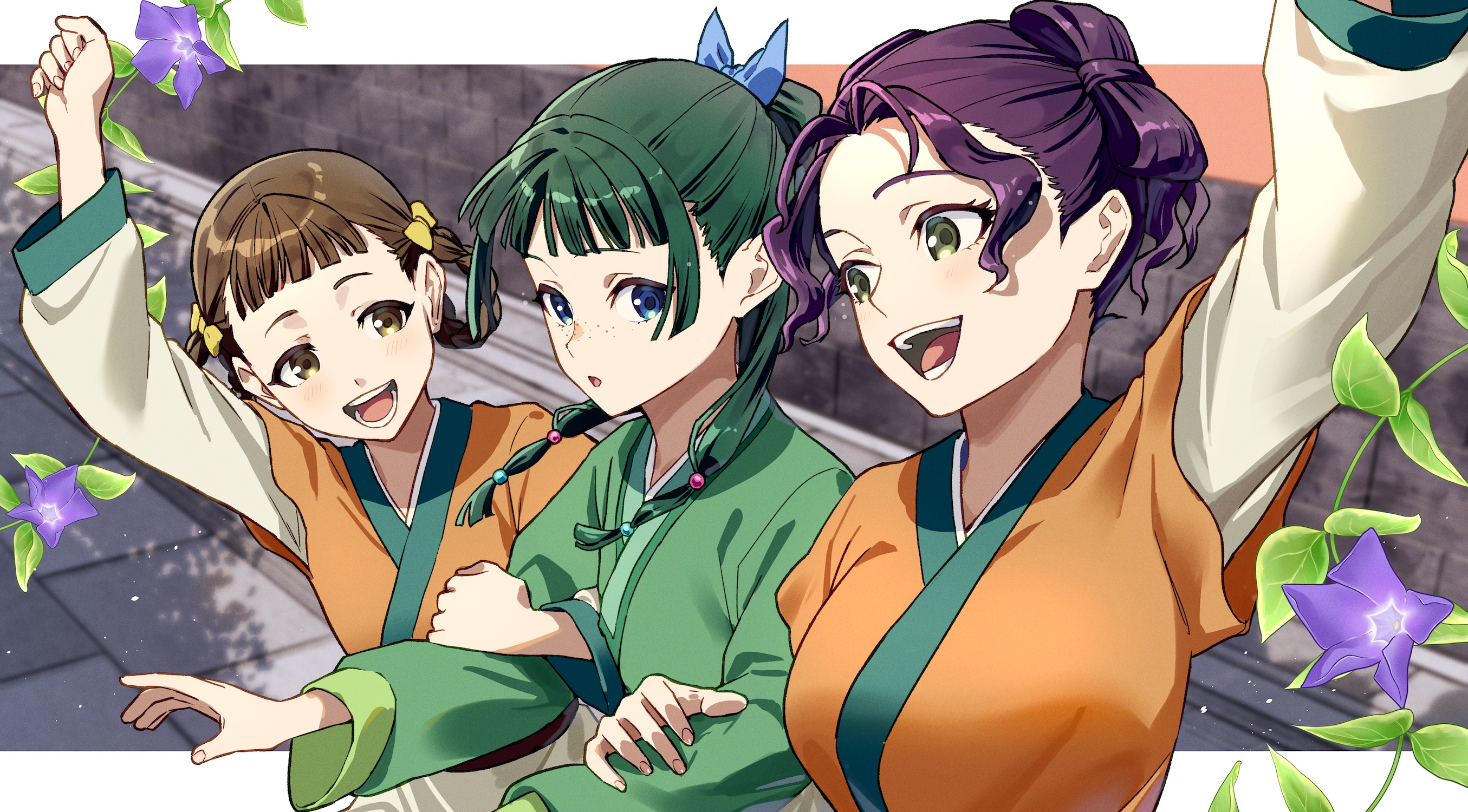 3girls :d :o arm_up beads blue_bow blue_hair blunt_bangs bow breasts brick_road brick_wall brown_eyes brown_hair cheering chinese_clothes clenched_hands fire flower freckles green_eyes green_hanfu green_robe green_skirt hair_beads hair_ornament hair_rings hairstyle_request hanfu highres kusuriya_no_hitorigoto large_breasts leaf locked_arms looking_to_the_side maomao_(kusuriya_no_hitorigoto) multiple_girls nanao_itsuki open_mouth orange_hanfu orange_robe plant purple_flower purple_hair robe shisui_(kusuriya_no_hitorigoto) skirt smile xiaolan_(kusuriya_no_hitorigoto) yellow_bow