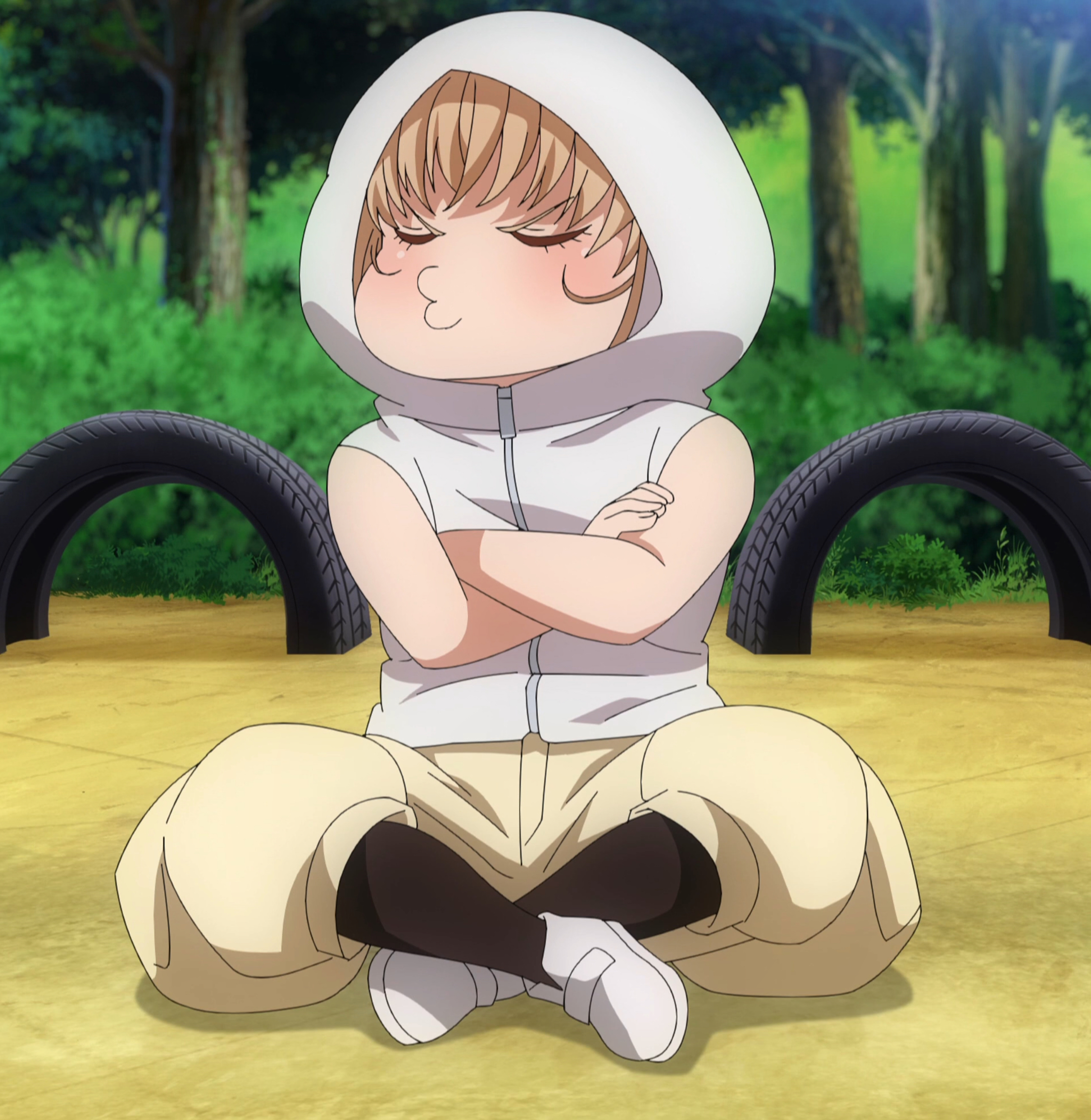 1girl absurdres anime_screenshot blush child closed_eyes closed_mouth crossed_arms elf-san_wa_yaserarenai. female_focus full_body highres hood hood_up hoodie indian_style kobo_(elf-san_wa_yaserarenai.) outdoors pants pout sitting sleeveless sleeveless_hoodie solo stitched third-party_edit unused_tire white_footwear white_hoodie white_pants