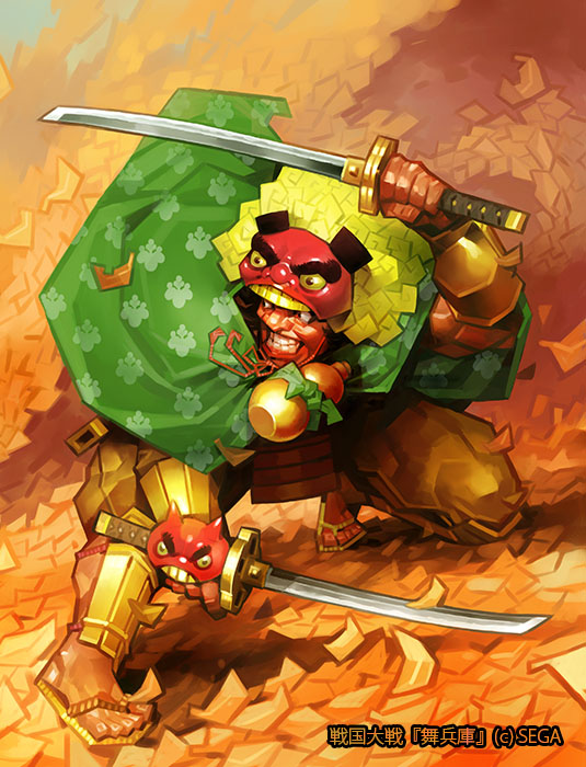 1boy armor autumn_leaves black_eyes black_hair brown_pants cloak commentary_request copyright_notice dual_wielding floating_clothes full_body gourd green_cloak grin holding holding_sword holding_weapon katana leaf looking_ahead maihyougo_(sengoku_taisen) male_focus mask mask_on_head neck official_art on_one_knee oni_mask pants red_mask red_ribbon ribbon sandals sengoku_taisen smile solo sword toenails toes unmoving_pattern weapon yamamoto_akifumi yellow_sandals