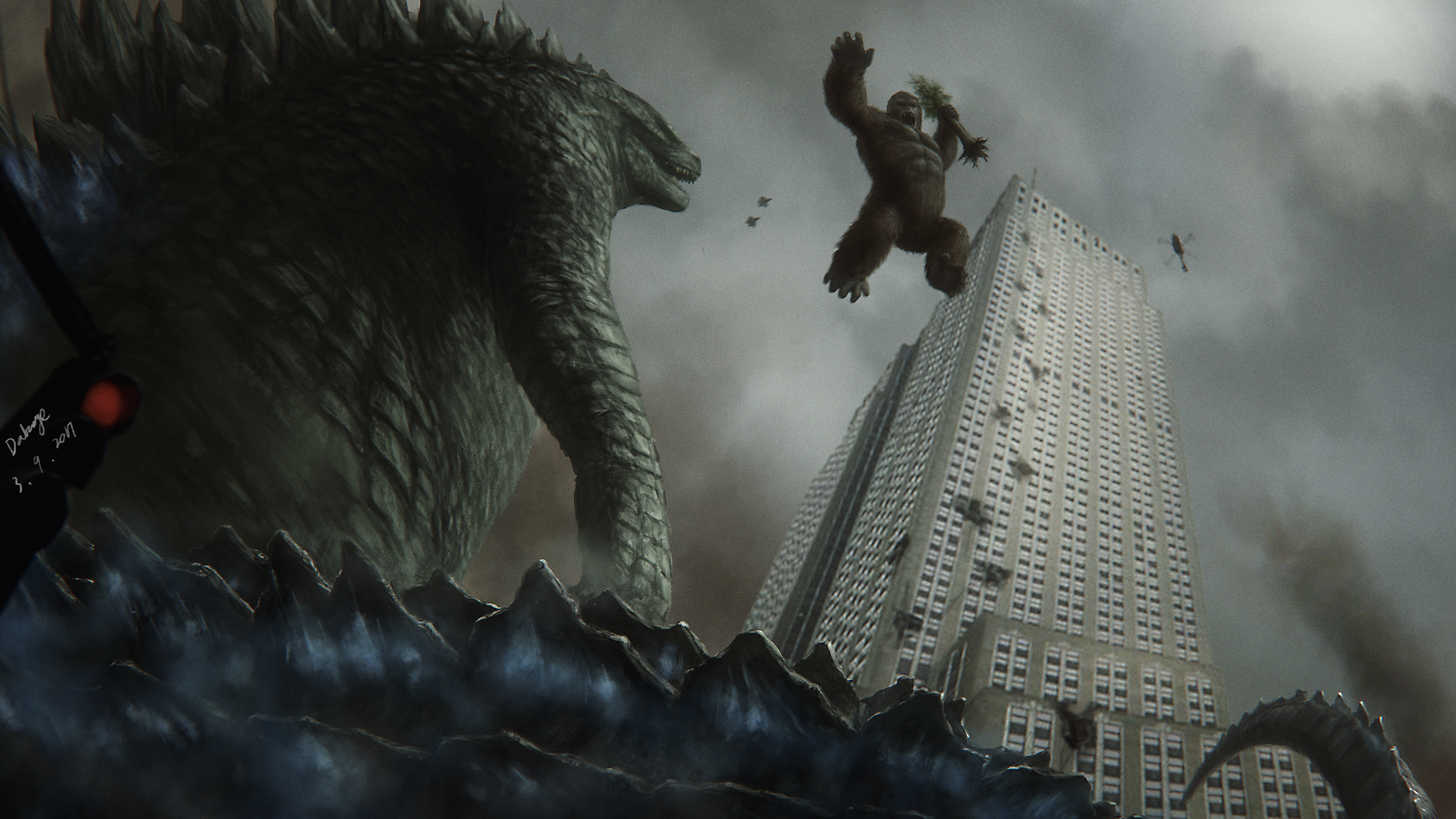 abs absurdres aircraft ape claws cloud cloudy_sky crossover dakouye destruction dinosaur flying giant giant_monster godzilla godzilla_(series) godzilla_vs._kong gorilla helicopter highres jumping kaiju king_kong king_kong_(series) legendary_pictures monster monsterverse muscular muscular_other no_humans open_mouth overcast pectorals realistic roaring sharp_teeth sky storm tail teeth toho traffic_light tree