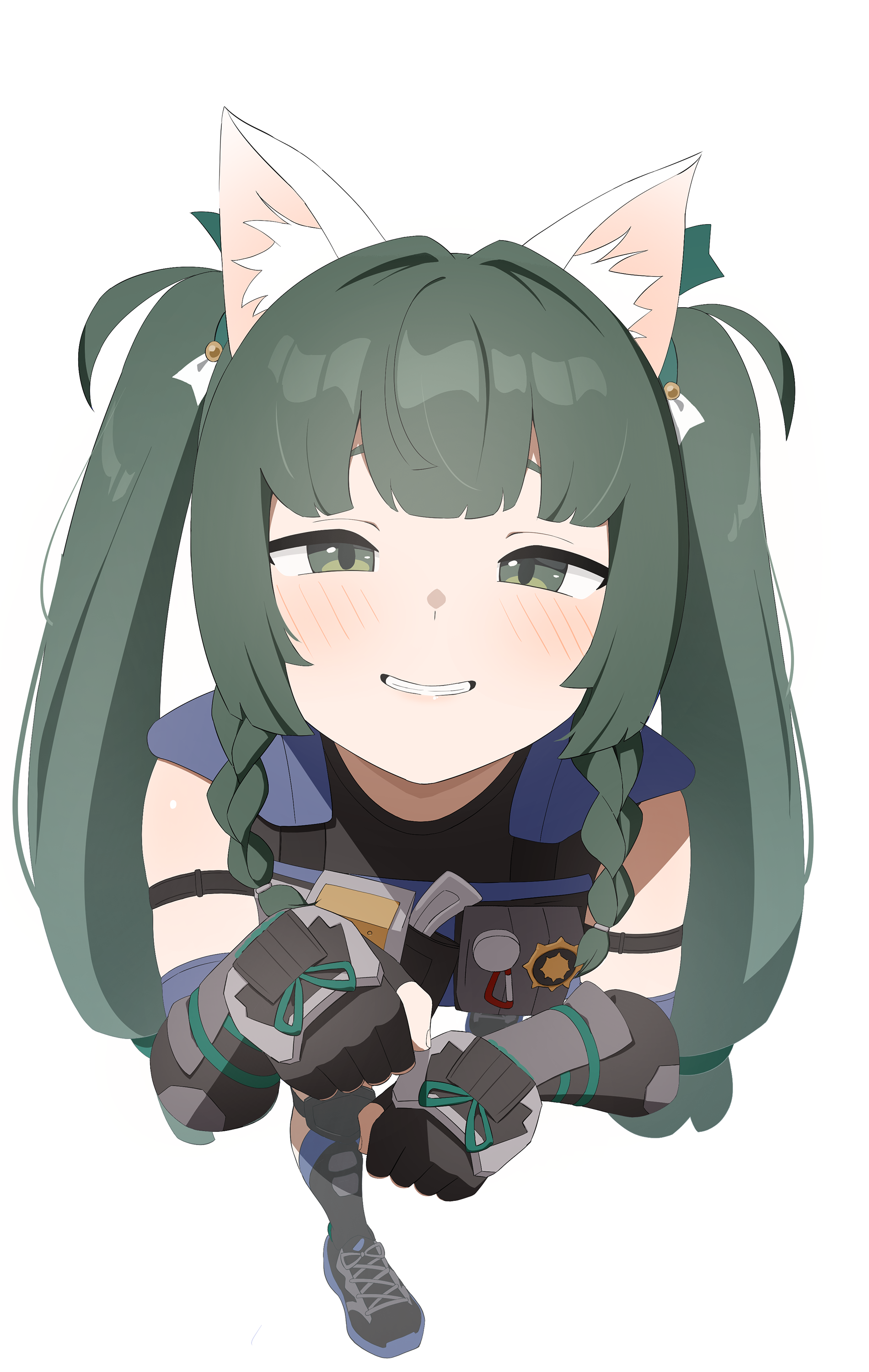 1girl absurdres android animal_ears black_gloves blunt_bangs blush cat_ears clenched_teeth fingernails from_above full_body gloves green_eyes green_hair highres kumacy_0 long_hair looking_at_viewer qingyi_(zenless_zone_zero) sidelocks simple_background smile solo teeth white_background zenless_zone_zero