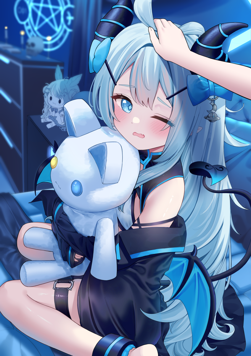 2girls ahoge akugaki_koa bikini black_horns black_jacket blue_eyes blue_hair blurry blurry_background blush character_doll commentary commission doll english_commentary fang flat_chest foot_out_of_frame headpat highres horns hugging_doll hugging_object chromashift indoors ine_(ineinnen) jacket lalabell_lullaby light_blue_hair long_hair long_sleeves multiple_girls o-ring o-ring_thigh_strap off_shoulder on_bed one_eye_closed pixiv_commission shadow sidelocks sitting skin_fang skull solo_focus star-shaped_pupils star_(symbol) stuffed_animal stuffed_cat stuffed_toy swimsuit symbol-shaped_pupils thigh_strap very_long_hair virtual_youtuber wariza white_bikini