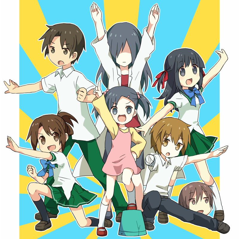 2boys 4girls agasaki_yuna black_hair blonde_hair blunt_bangs brown_hair doctor_agasaki doll_(game) dress fujita_toshiaki kurume_yuki kusunoki_erina lab_coat mizuki_motoya mother_and_child mother_and_daughter multiple_boys multiple_girls parent_and_child pink_dress ponytail school_uniform serafuku severed_head shinomaru_hajime short_hair short_ponytail twintails