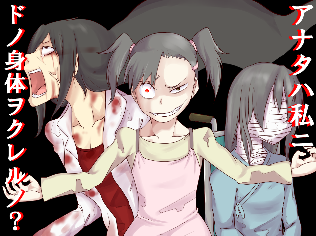 3girls agasaki_yuna agasaki_yuna_(real) bandage_on_face bandages bandages_over_eyes black_hair blood blood_on_clothes commentary crazy_eyes crazy_smile doctor_agasaki doll_(game) dress english_commentary hospital_gown lab_coat long_hair mother_and_child mother_and_daughter multiple_girls parent_and_child pink_dress short_hair smile translation_request twintails wheelchair yagidama1211