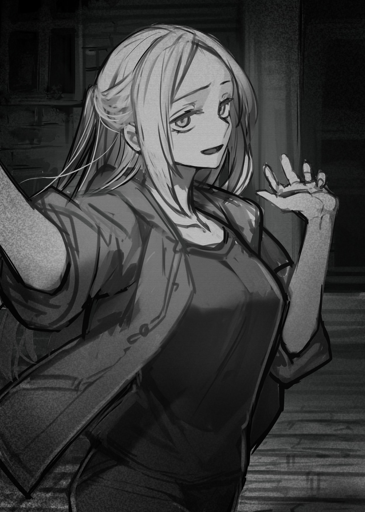 1girl cat_in_the_box girl_(cat_in_the_box) greyscale highres hood hood_down hoodie komota_(kanyou_shoujo) monochrome solo standing