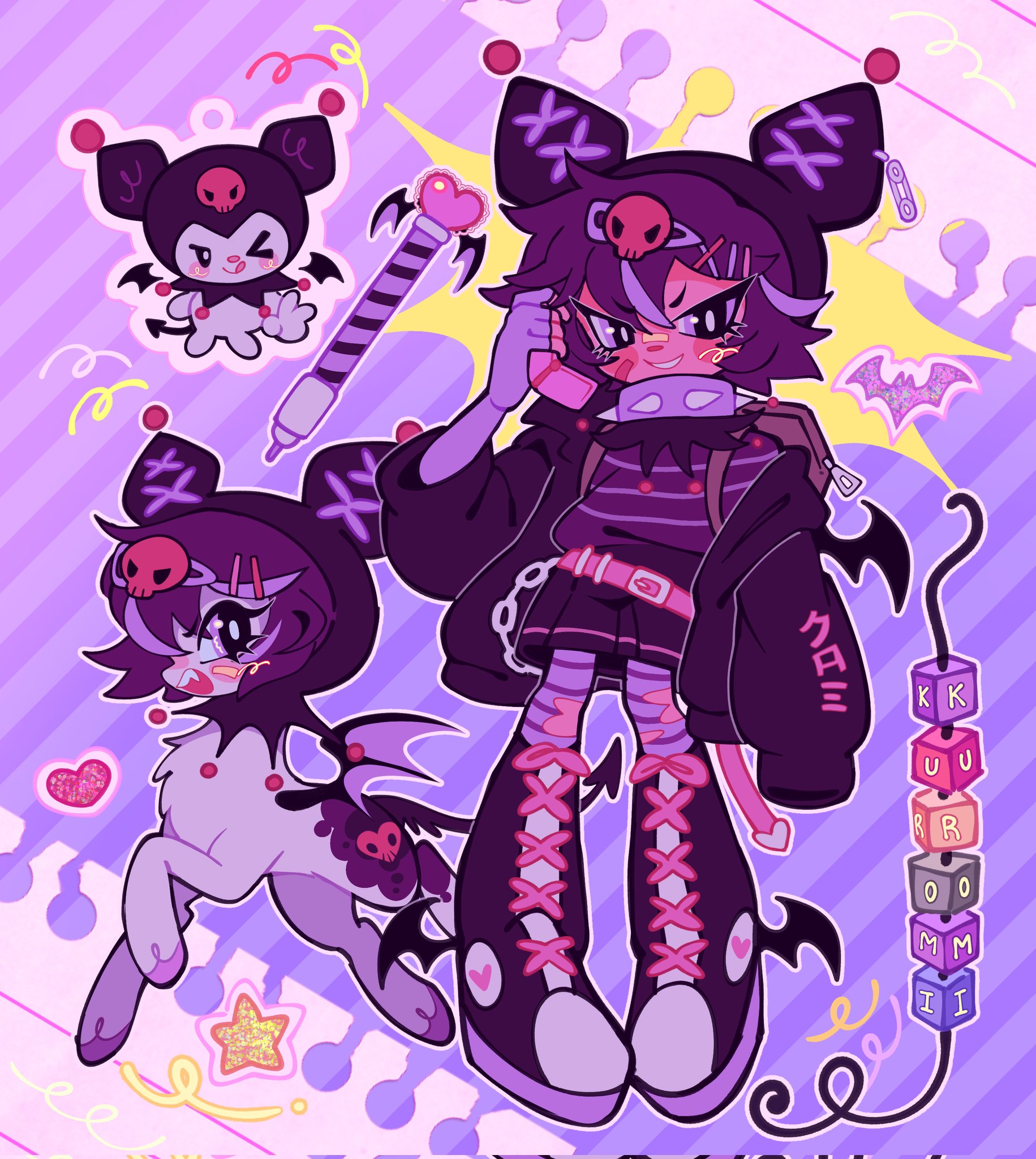 2girls animal animal_ears animalization black_hair boots cellphone character_name chibi chibikemo collar corrupted_twitter_file cutie_mark demon_tail demon_wings emo_fashion flip_phone full_body furry humanoid_and_humanization furry_female highres holding holding_phone humanization jacket jammy_(bunbunbewwii) kuromi looking_at_viewer multicolored_hair multiple_girls multiple_persona my_little_pony my_little_pony:_friendship_is_magic my_melody_(series) open_clothes open_jacket person_and_animalization phone purple_eyes purple_hair purple_theme rabbit_ears rabbit_girl sanrio shoes skirt sneakers spiked_collar spikes standing streaked_hair tail winged_footwear wings