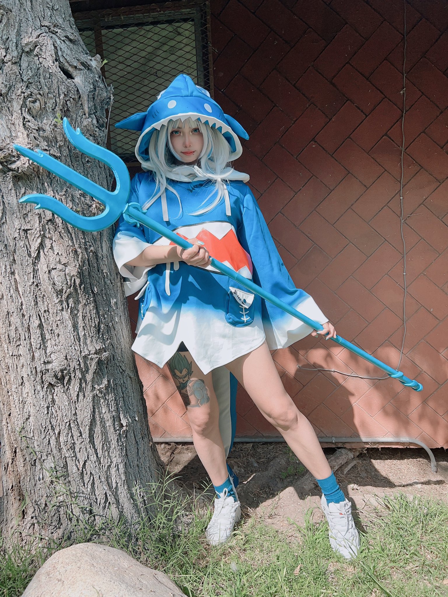 1girl animal_hood arelly_trujillo arm_at_side blue_eyes blue_hair blue_hoodie blue_socks closed_mouth cosplay cosplay_photo female_focus gawr_gura gawr_gura_(1st_costume) gawr_gura_(cosplay) hand_up highres holding holding_polearm holding_weapon hololive hololive_english hood hood_up hoodie leg_tattoo lips long_hair long_sleeves looking_at_viewer multicolored_hair outdoors photo_(medium) polearm real_life shark_hood shoes smile sneakers socks solo standing streaked_hair tattoo trident two-tone_hair two-tone_hoodie virtual_youtuber weapon white_hair white_hoodie white_shoes