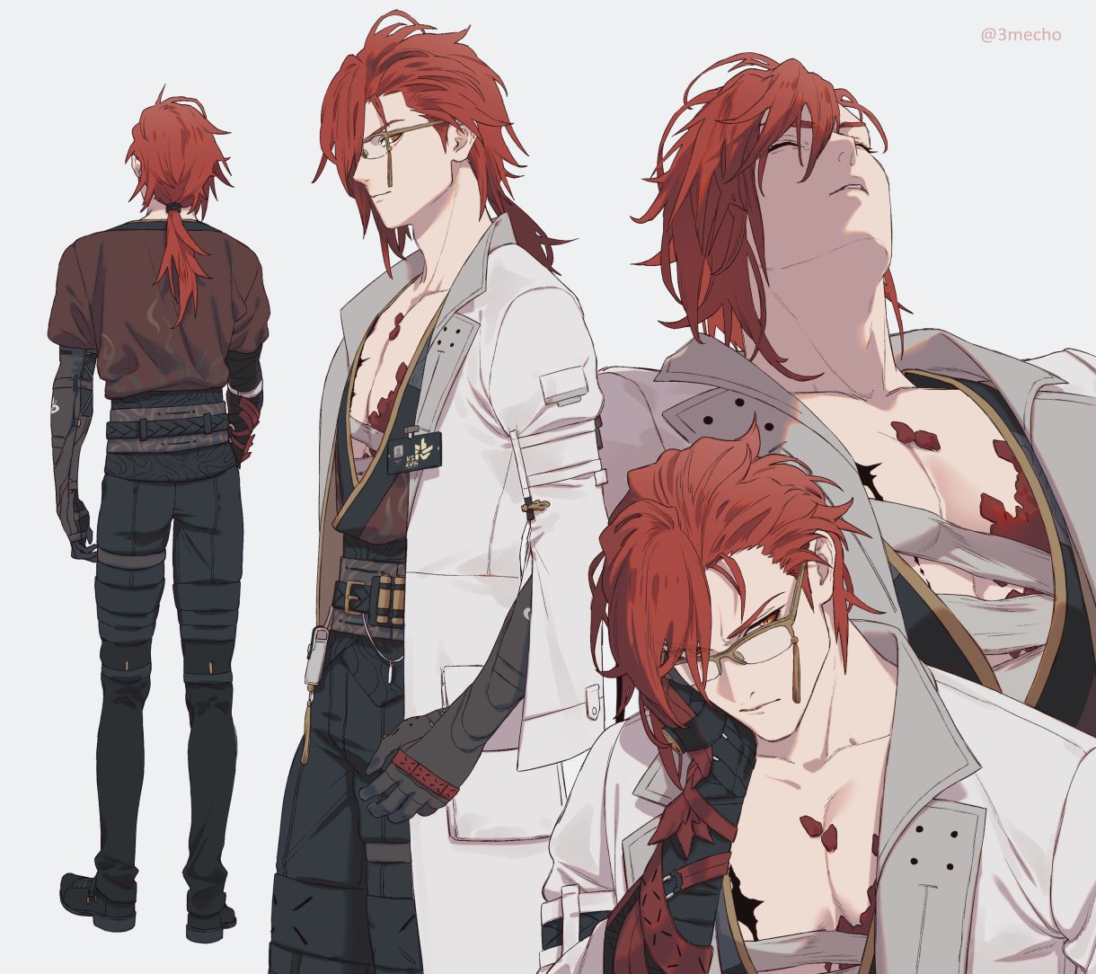 1boy bandages belt belt_buckle belt_pouch black_belt black_footwear black_gloves black_pants black_sash buckle closed_eyes closed_mouth coat collarbone elbow_gloves emu_(3mecho) facing_away full_body glasses gloves hand_up hashtag-only_commentary head_rest lab_coat lapels long_hair looking_at_viewer low_ponytail male_focus mortefi_(wuthering_waves) multiple_views open_clothes open_coat over-rim_eyewear pants parted_lips pectorals pocket ponytail pouch red_eyes red_gloves red_hair red_shirt sash scales semi-rimless_eyewear serious shirt shoes short_sleeves sideways_glance simple_background sleeping tacet_mark_(wuthering_waves) tassel thigh_strap two-tone_gloves upper_body v-shaped_eyebrows white_background white_coat wuthering_waves yellow-framed_eyewear