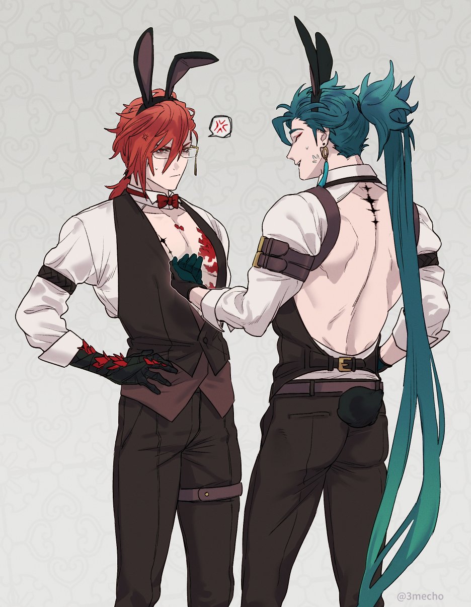 2boys ^_^ anger_vein angry animal_ear_hairband animal_ears aqua_hair arm_belt artist_name back back_cutout backless_outfit belt black_belt black_gloves black_hairband black_pants black_vest bow bowtie buttons closed_eyes closed_mouth clothing_cutout collarbone commentary_request detached_collar emu_(3mecho) eyeshadow facing_away fake_animal_ears fake_tail frown glasses gloves grey_background hairband hand_on_own_hip high_ponytail highres jiyan_(wuthering_waves) long_hair long_sleeves looking_at_another low_ponytail makeup male_focus median_furrow mortefi_(wuthering_waves) multiple_boys open_mouth over-rim_eyewear pants pectorals ponytail rabbit_boy rabbit_ear_hairband rabbit_ears rabbit_tail red_bow red_bowtie red_eyes red_eyeshadow red_hair scales semi-rimless_eyewear shirt simple_background smile speech_bubble spoken_anger_vein standing sweatdrop tacet_mark_(wuthering_waves) tail teeth thigh_strap twitter_username upper_teeth_only v-shaped_eyebrows very_long_hair vest white_shirt wuthering_waves yellow-framed_eyewear