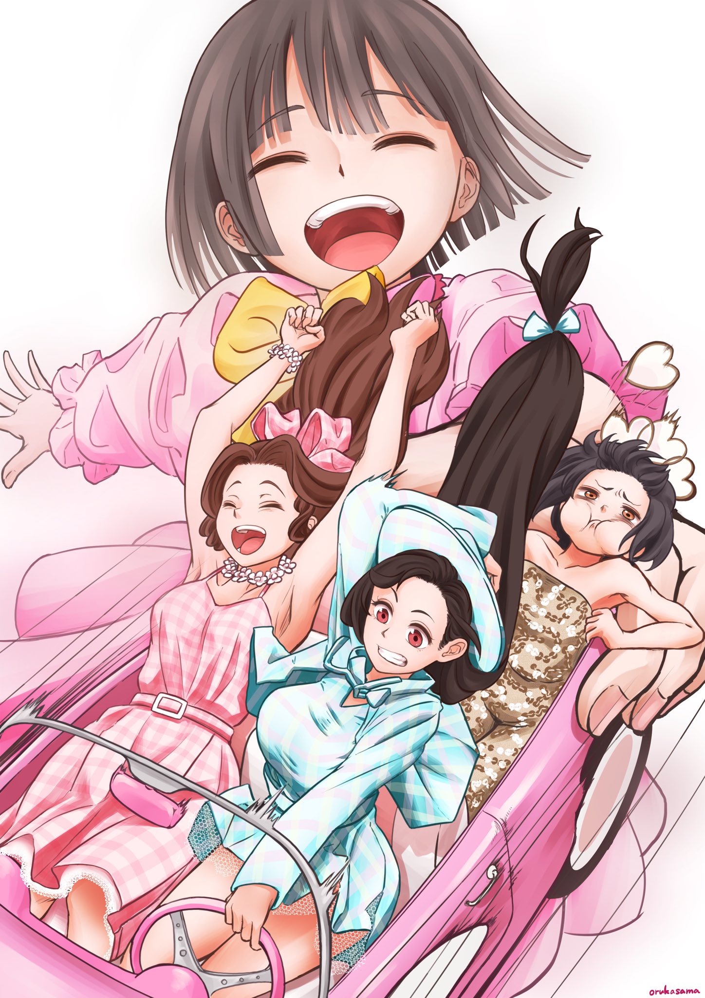 4girls aerith_gainsborough alternate_costume barbie_(character) barbie_(franchise) barbie_(live_action) black_hair blue_bow blue_dress blue_hat blue_jacket blunt_bangs blunt_ends bow bowtie bracelet breasts brown_eyes brown_hair car child clenched_teeth closed_eyes convertible derivative_work dress driving final_fantasy final_fantasy_vii final_fantasy_vii_rebirth final_fantasy_vii_remake flower flower_bracelet flower_necklace grin hair_bow hat highres holding holding_unworn_clothes holding_unworn_hat jacket jewelry large_breasts long_hair low-tied_long_hair marlene_wallace medium_breasts motor_vehicle multiple_girls necklace open_mouth parted_bangs pink_bow pink_dress plaid_clothes plaid_dress rear-view_mirror short_dress short_hair sick sleeveless sleeveless_dress smile steering_wheel stereotypical_barbie_(live_action) strapless strapless_dress teeth tifa_lockhart unworn_hat unworn_headwear white_background wolkat yellow_bow yellow_bowtie yuffie_kisaragi