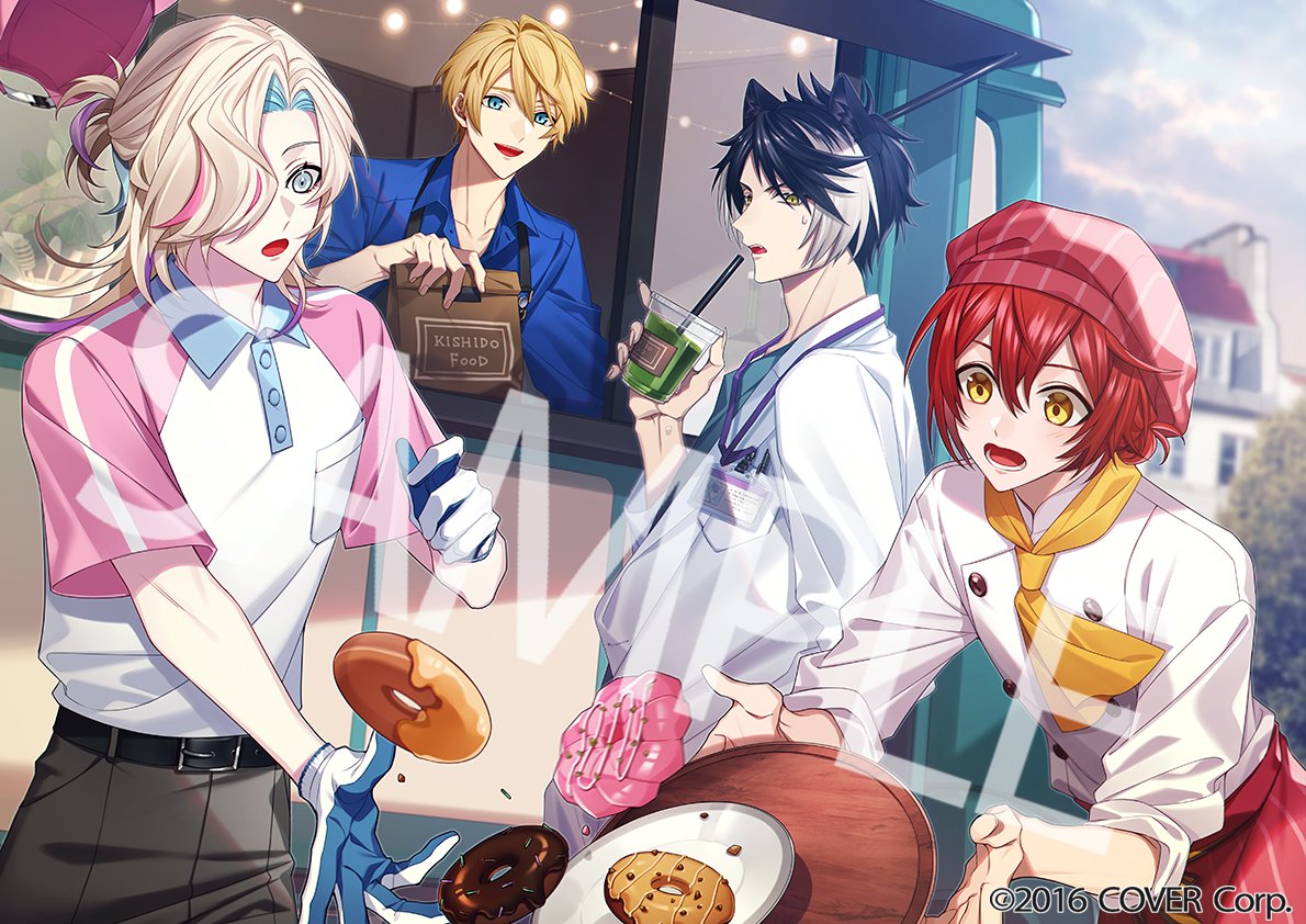 4boys :d :o alternate_costume alternate_hairstyle animal_ears apron aqua_hair aqua_shirt bag belt black_apron black_belt black_hair blonde_hair blue_eyes blue_gloves blue_shirt building buttons chef coat collared_shirt copyright_notice cowboy_shot cup curtained_hair day delivery disposable_cup doctor donut double-breasted drinking_straw dropping fingernails food food_truck gloves grey_pants hair_between_eyes hair_bun hair_over_one_eye half_updo hanasaki_miyabi hat holding holding_bag holding_cup holding_tray holostars id_card jackal_boy jackal_ears jacket kageyama_shien kishido_temma lab_coat lanyard long_sleeves looking_to_the_side male_focus medical_scrubs medium_hair multicolored_hair multiple_boys neckerchief object_in_pocket official_art open_clothes open_coat open_collar open_mouth outdoors pants paper_bag pen_in_pocket pink_hair pink_hat pink_sleeves plate pocket polo_shirt red_apron red_hair sample_watermark sharp_fingernails shirt short_hair single_hair_bun sleeves_rolled_up smile streaked_hair striped_apron striped_clothes striped_headwear surprised sweatdrop swept_bangs tray tree tripping two-tone_gloves two-tone_hair uniform upper_body utsugi_uyu virtual_youtuber waist_apron watermark white_coat white_eyes white_gloves white_hair white_jacket white_shirt y_at_(yuuya) yellow_eyes yellow_neckerchief