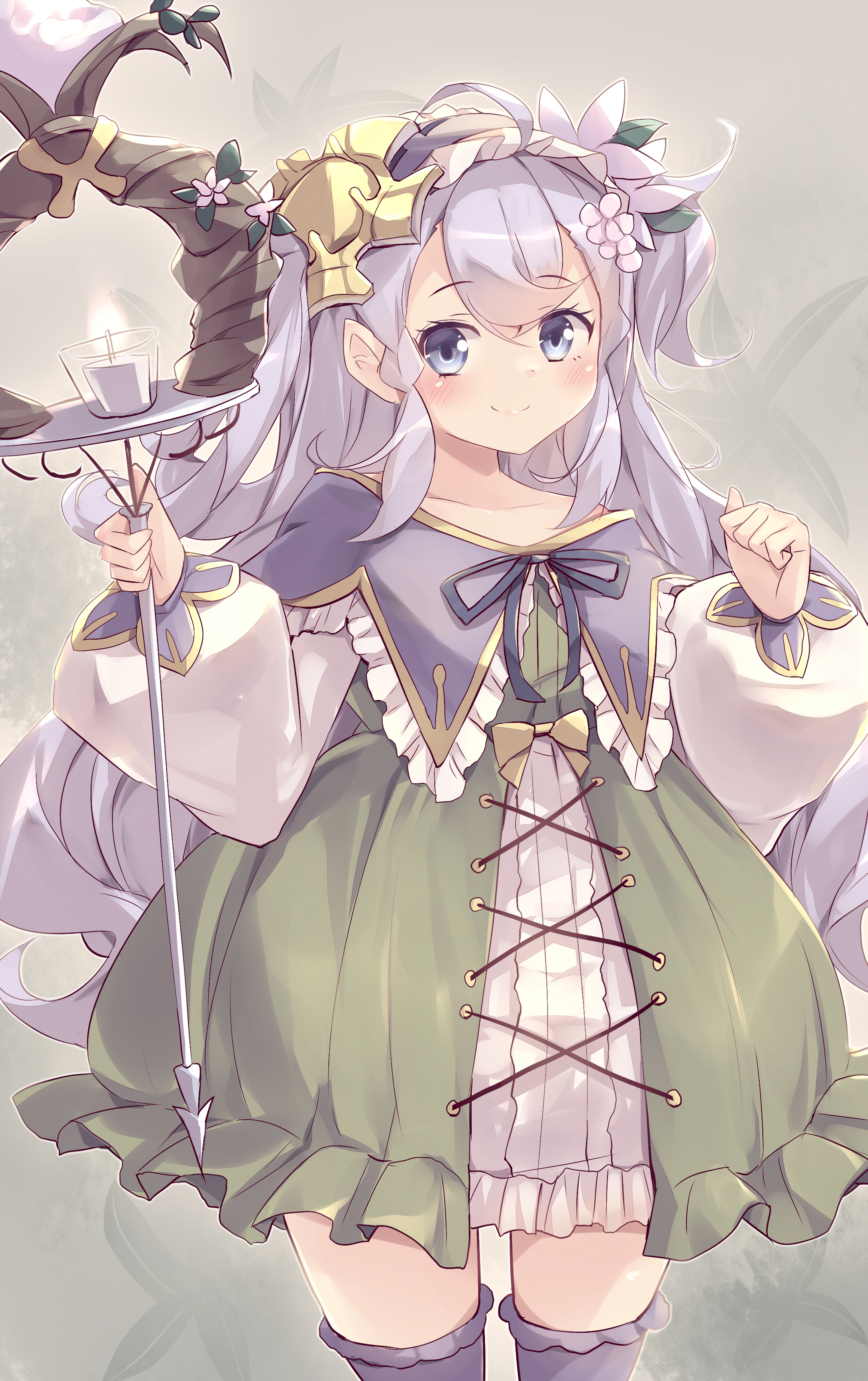 1girl absurdres adapted_costume ahoge aromage_jasmine dress duel_monster flower green_dress hair_flower hair_ornament highres holding holding_staff kanzakietc looking_at_viewer puffy_sleeves purple_eyes purple_hair smile solo staff standing thighhighs yu-gi-oh! zettai_ryouiki