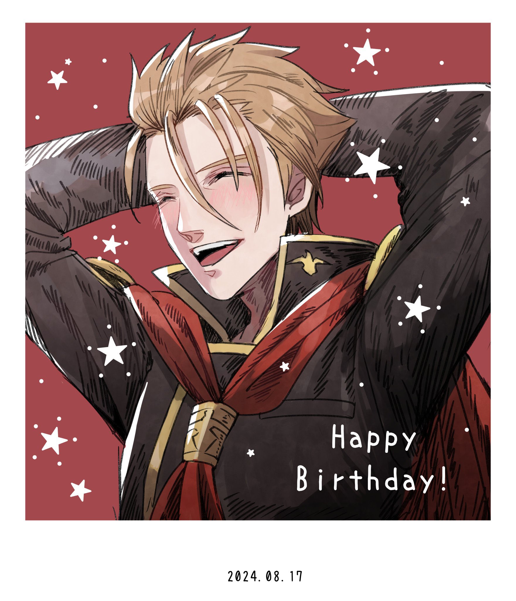 1boy arms_behind_head black_jacket blonde_hair border cloak closed_eyes dated final_fantasy final_fantasy_type-0 gold_trim hair_between_eyes happy_birthday highres jack_(fft-0) jacket light_blush long_sleeves male_focus military_uniform nnnmmg0725 open_mouth red_background red_cloak school_uniform short_hair smile solo upper_body white_border