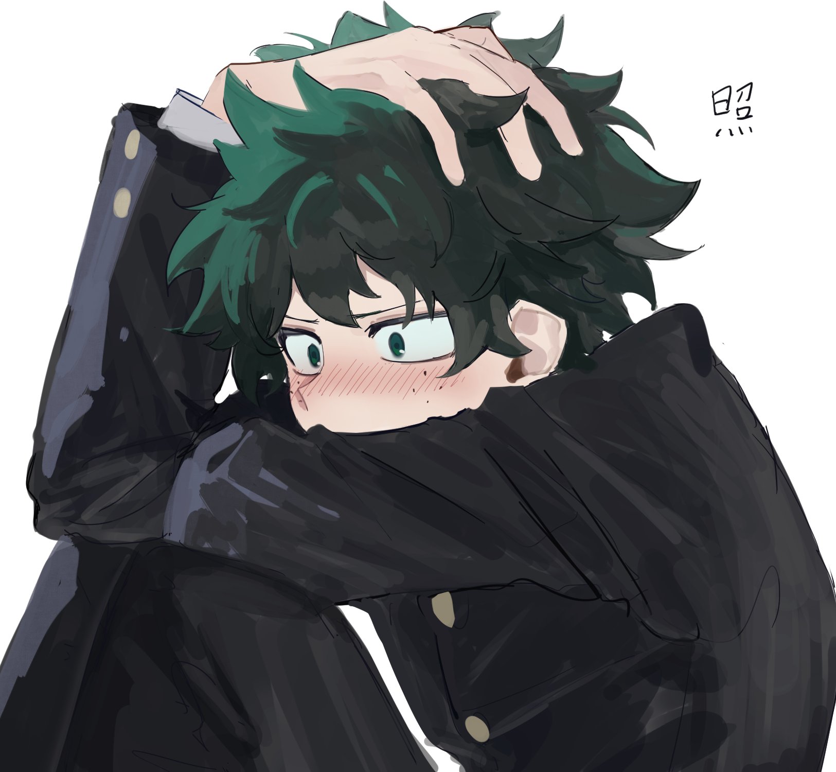 1boy blush boku_no_hero_academia freckles green_eyes green_hair highres midoriya_izuku school_uniform simple_background solo spiked_hair tkrt_rkgk u.a._school_uniform white_background