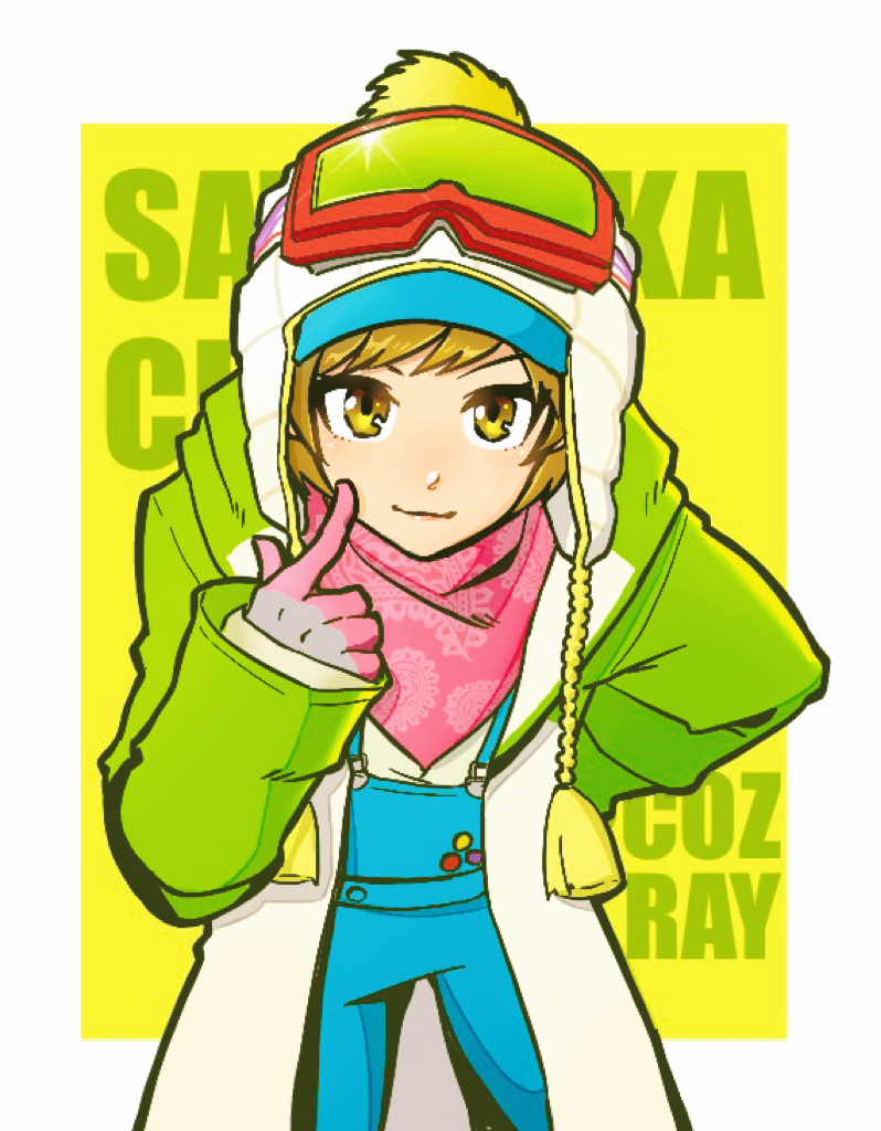 1girl artist_name bandana beanie bent_over blue_overalls bob_cut brown_hair buttons character_name coat cozray finger_to_face gloves goggles goggles_on_headwear green_coat hat light_brown_hair lips looking_at_viewer overalls paisley persona persona_4 pink_bandana pom_pom_(clothes) pom_pom_beanie print_bandana satonaka_chie ski_goggles solo winter_clothes yellow_eyes
